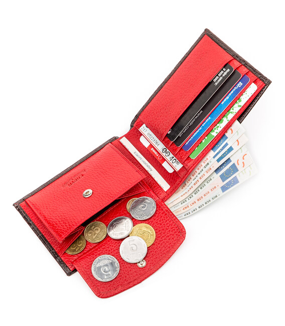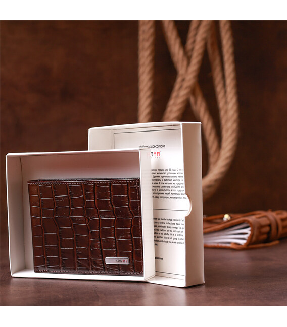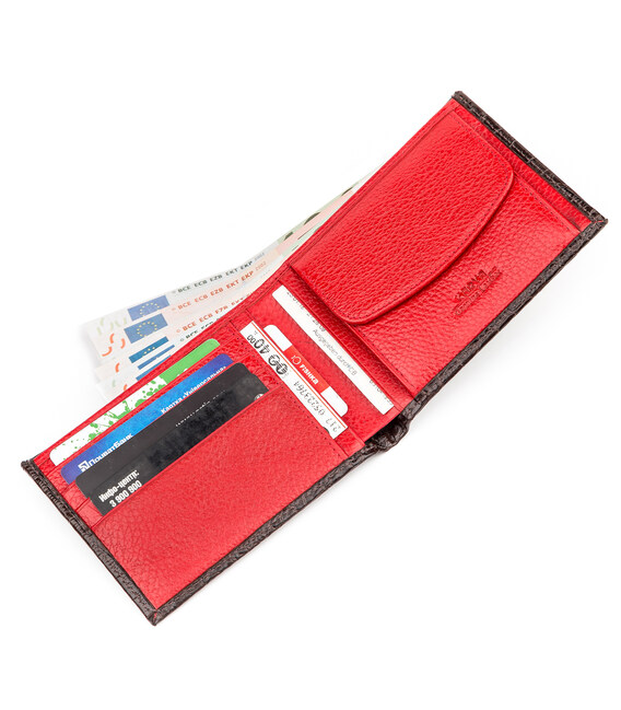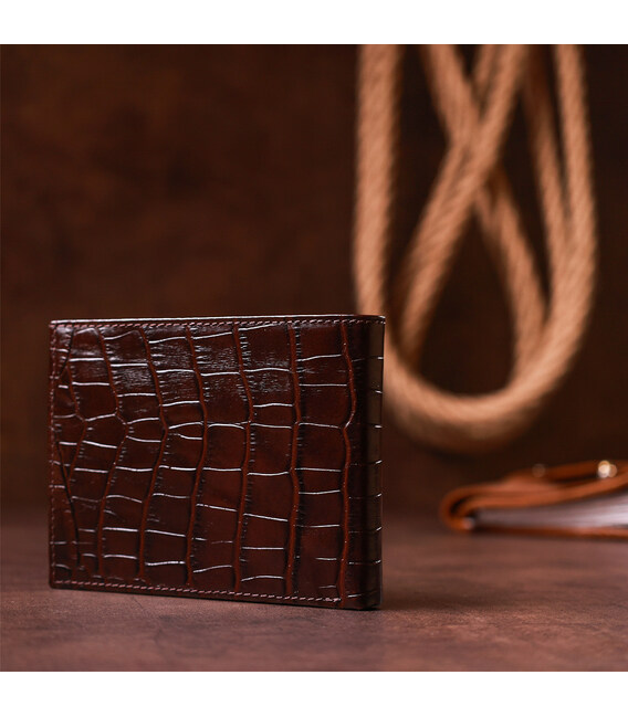 Коричневое мужское портмоне, из натуральной фактурной кожи под рептилию. Очень красивый и стильный аксессуар, который состоит из сочетания двух цветов кожи: коричневой снаружи и красной внутри. Отлично подойдет в качестве подарка и не оставит равнодушным ни одного мужчину.
