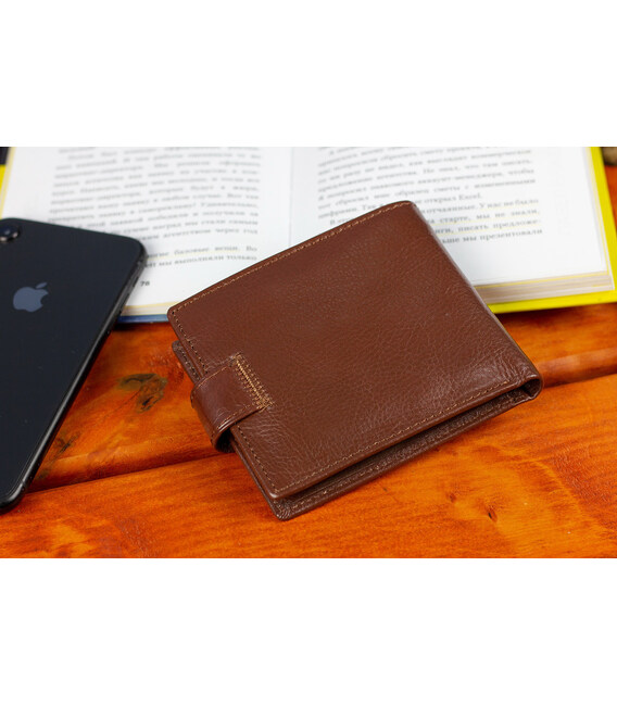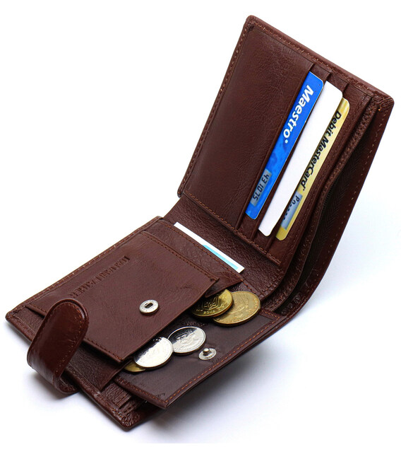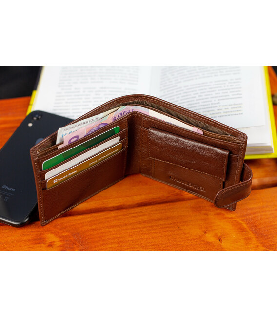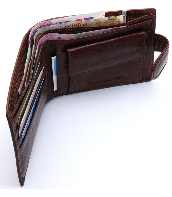 Беспроигрышным вариантом для хранения личных средств является кожаный кошелек с множеством отсеков и ячеек. Для бумажных купюр в нем отведено 3 отделения, одно из них со змейкой. Именно «под замком» удобно держать «золотой запас» денег. Документы можно положить в 2 скрытых кармана, подальше от любопытных глаз. В мужском кошельке также найдется место и для мелочи. Это компактный карманчик с кнопкой внутри аксессуара.