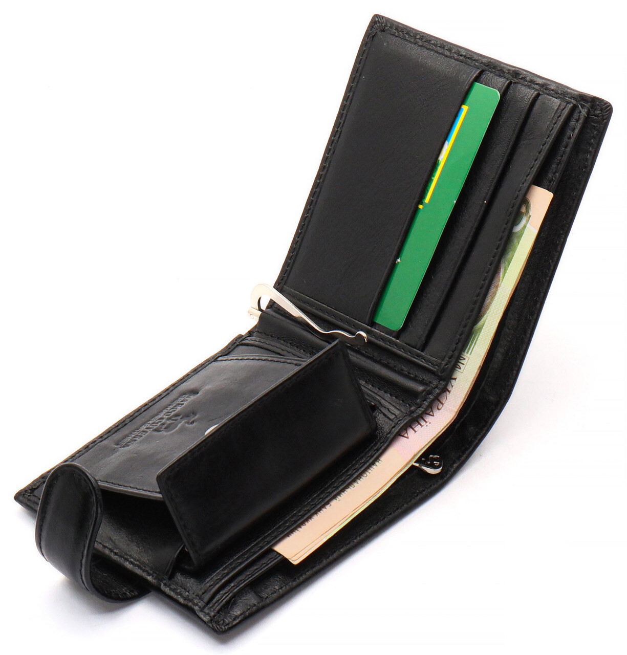 Мужское портмоне с зажимом отличается многофункциональностью. В трех больших отделениях помещается значительное количество купюр. Отложить определенную сумму можно в отдельную секцию, которая закрывается молнией. Прилегающие карманы нередко используются для хранения как денег, так и каких-то бумаг, даже визиток. Пластиковые карты лучше всего держать в трех ячейках. Для монет есть вместительный кармашек на кнопке. Уникальной особенностью этой модели мужского кошелька портмоне служит съемный фиксатор.