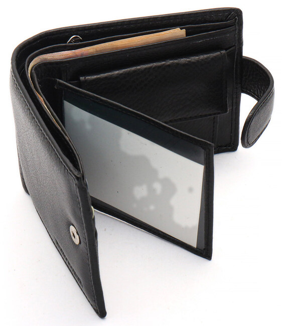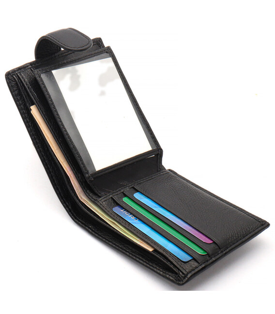 Удобный мужской кошелек в одно сложение выполнен из фактурной кожи высокого качества. При частом использовании материал не стирается и не портится. Для денег отведено три вместительных отделения. Задняя секция закрывается молнией, что позволяет отложить определенную сумму денег. Монетница на кнопке достаточно большая, поэтому в ней поместится вся мелочь. Квитанции, записки и другие бумажки удобно хранить в двух потайных карманах. Эта модель мужского кошелька выполнена по типу книжечки. В три ячейки можно положить банковские карты, а в прозрачных — водительские права, пропуск или фото.