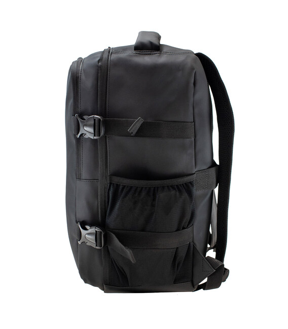 На фронтальной части расположена большая плоская кармана на молнии, которая подойдет для документов формата A4 и меньшая вертикальная кармана с отбивным элементом на замке. С обеих сторон есть сетчатые карманы с эластичной лентой по краям, которые удобно использовать для бутылки или зонта. Для комфорта рюкзак имеет уплотненную спинку и лямки, которые уменьшают нагрузку при ношении. На задней части предусмотрена лента для крепления на телескопическую ручку чемодана, а также компрессионные ремни, которые помогают удерживать форму и уменьшать объем при транспортировке.