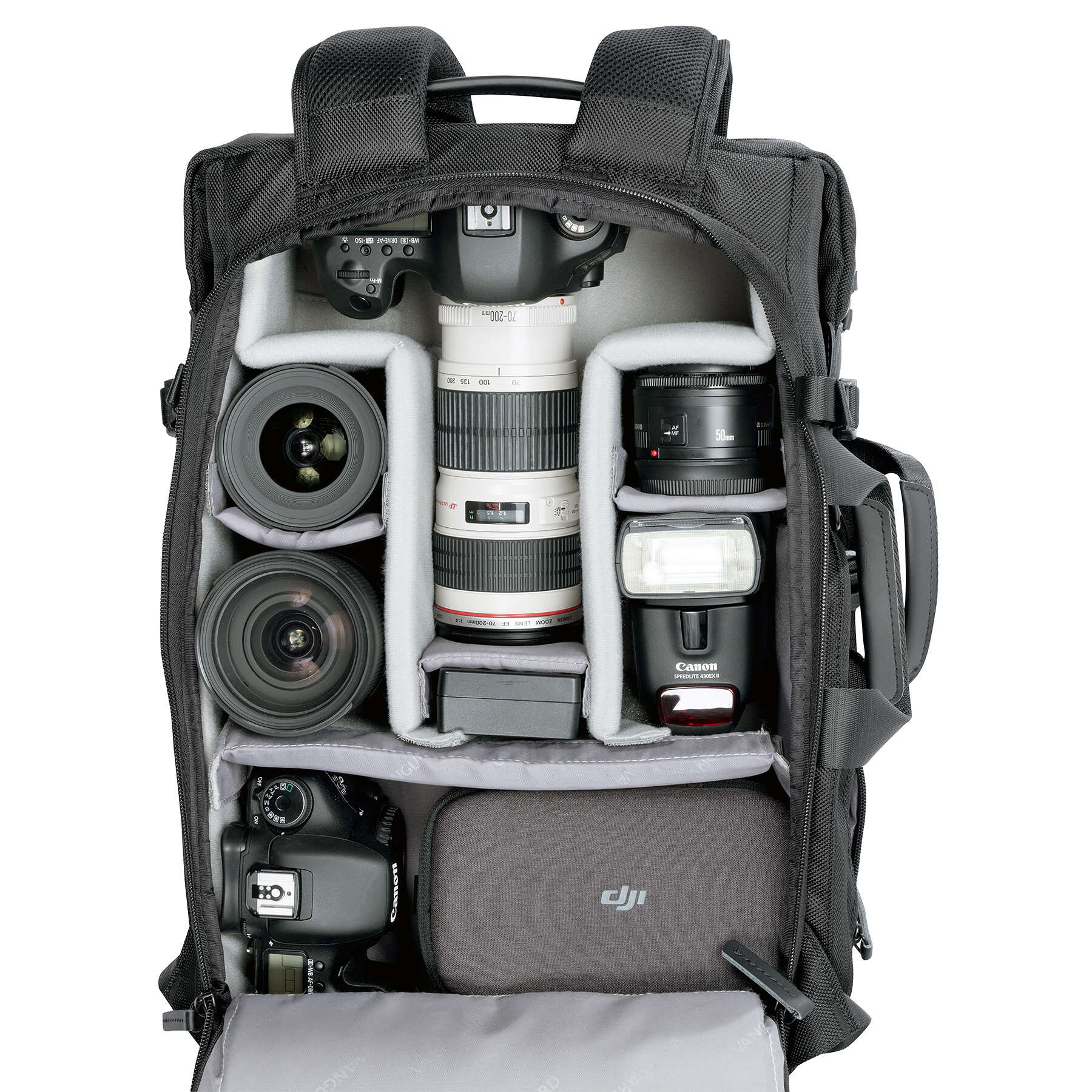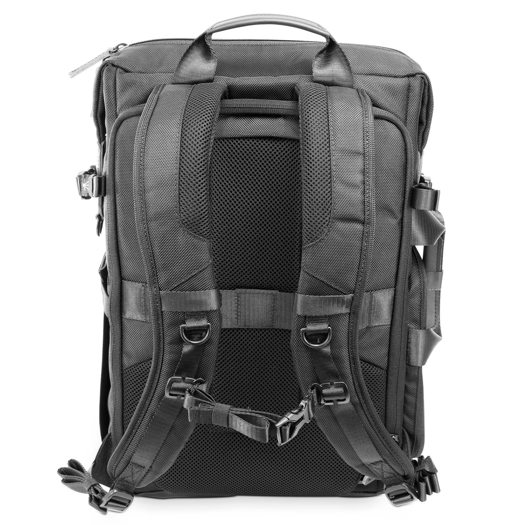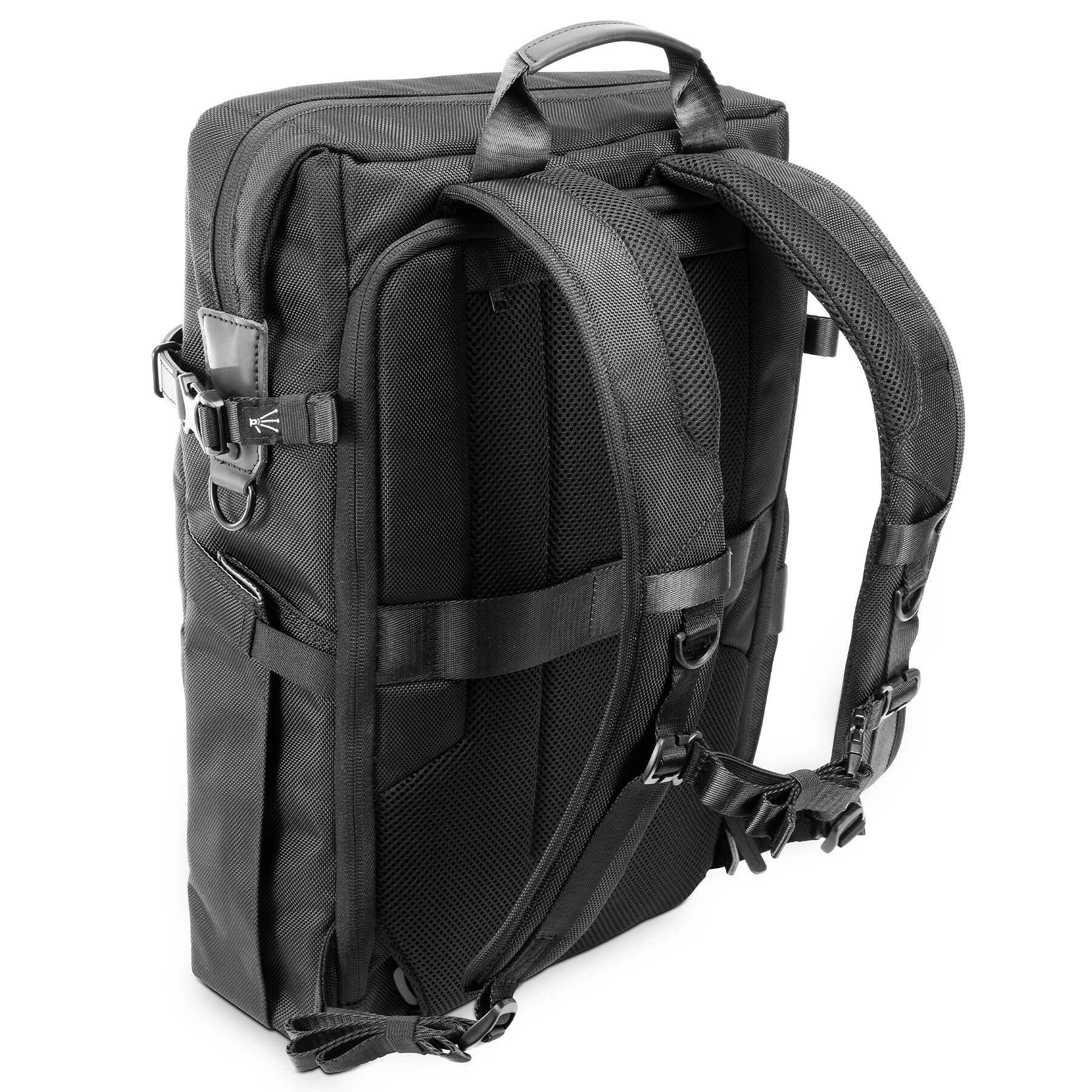 Рюкзак способен вместить полноценную DSLR-камеру с двумя-тремя сменными объективами, фотовспышку, зарядное устройство, небольшой дрон и массу других полезных аксессуаров, сбоку закрепить штатив. Отдельное защищенное отделение предназначено для ноутбука до 15", а также есть место для планшета и личных вещей. Есть скрытый карман на спинке для документов и кошелька, а также внешние карманы для бутылки воды.
