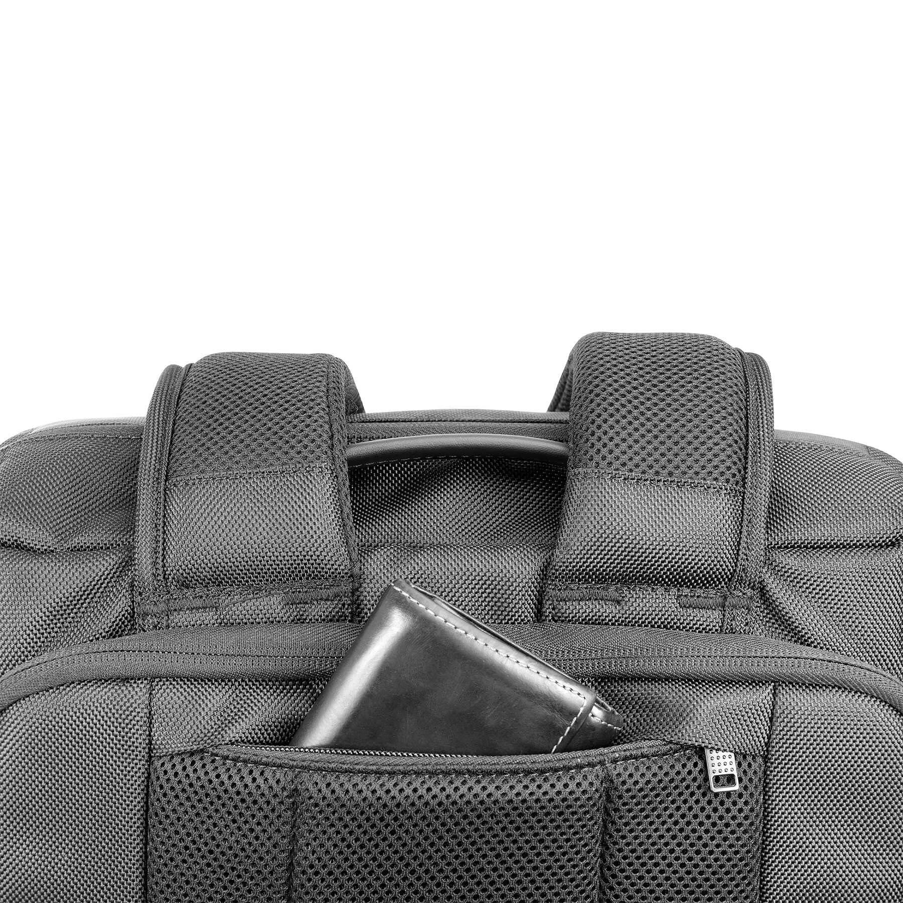 Эргономичная система переноски включает анатомическую спинку, регулируемые шлейки и мягкий плечевой ремень, который можно использовать в режиме сумки. Для удобства путешествий рюкзак оснащен поясом, спрятанным в специальном кармане, и может закрепиться на ручке чемодана с помощью поперечной ленты на спинке.