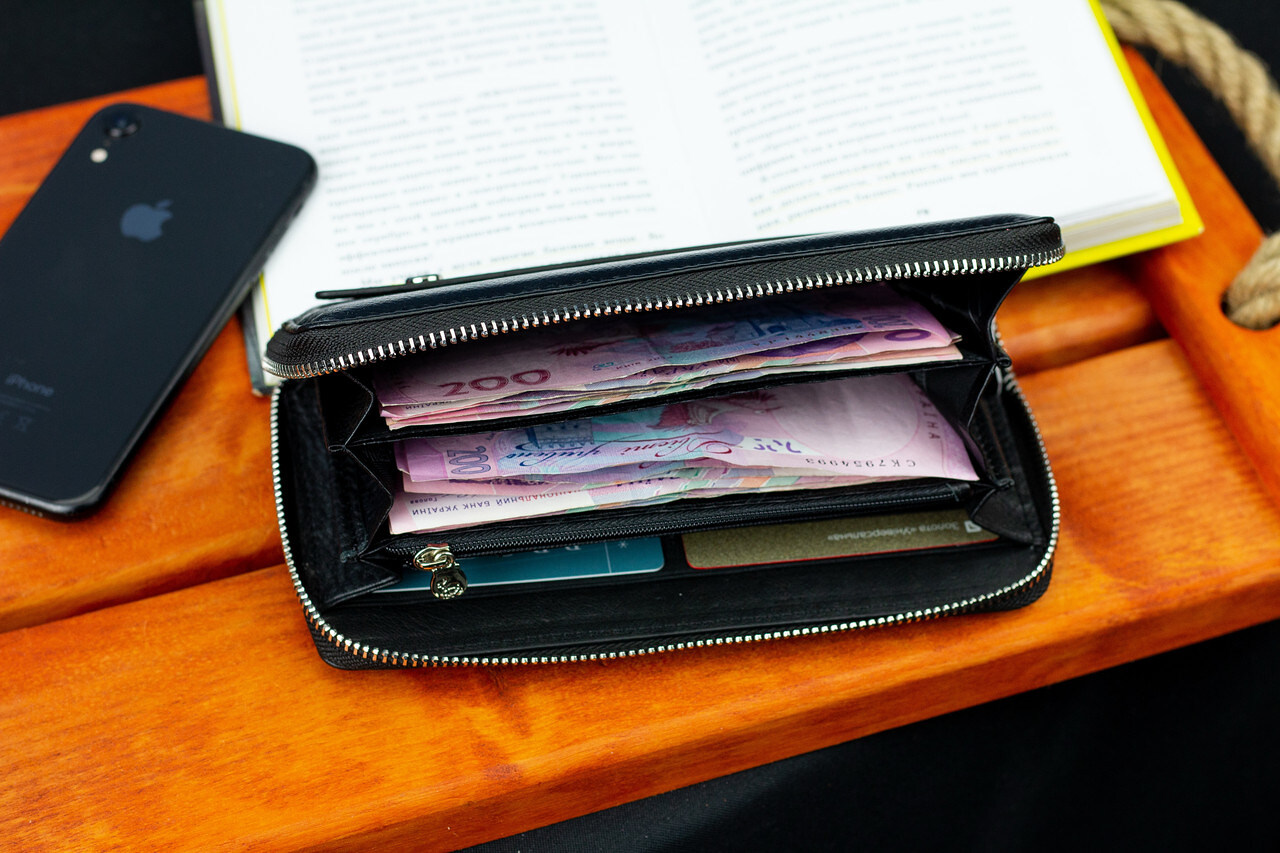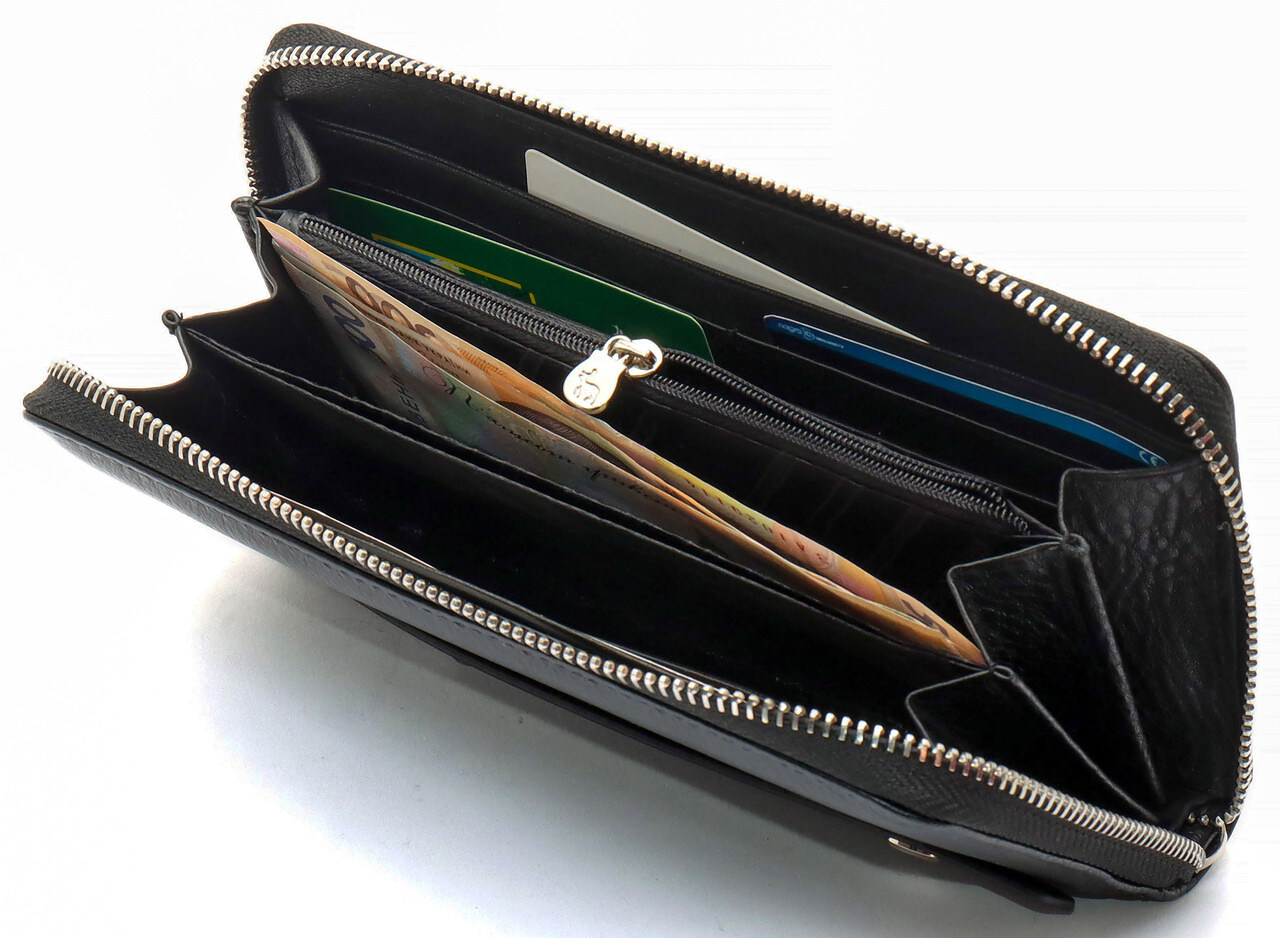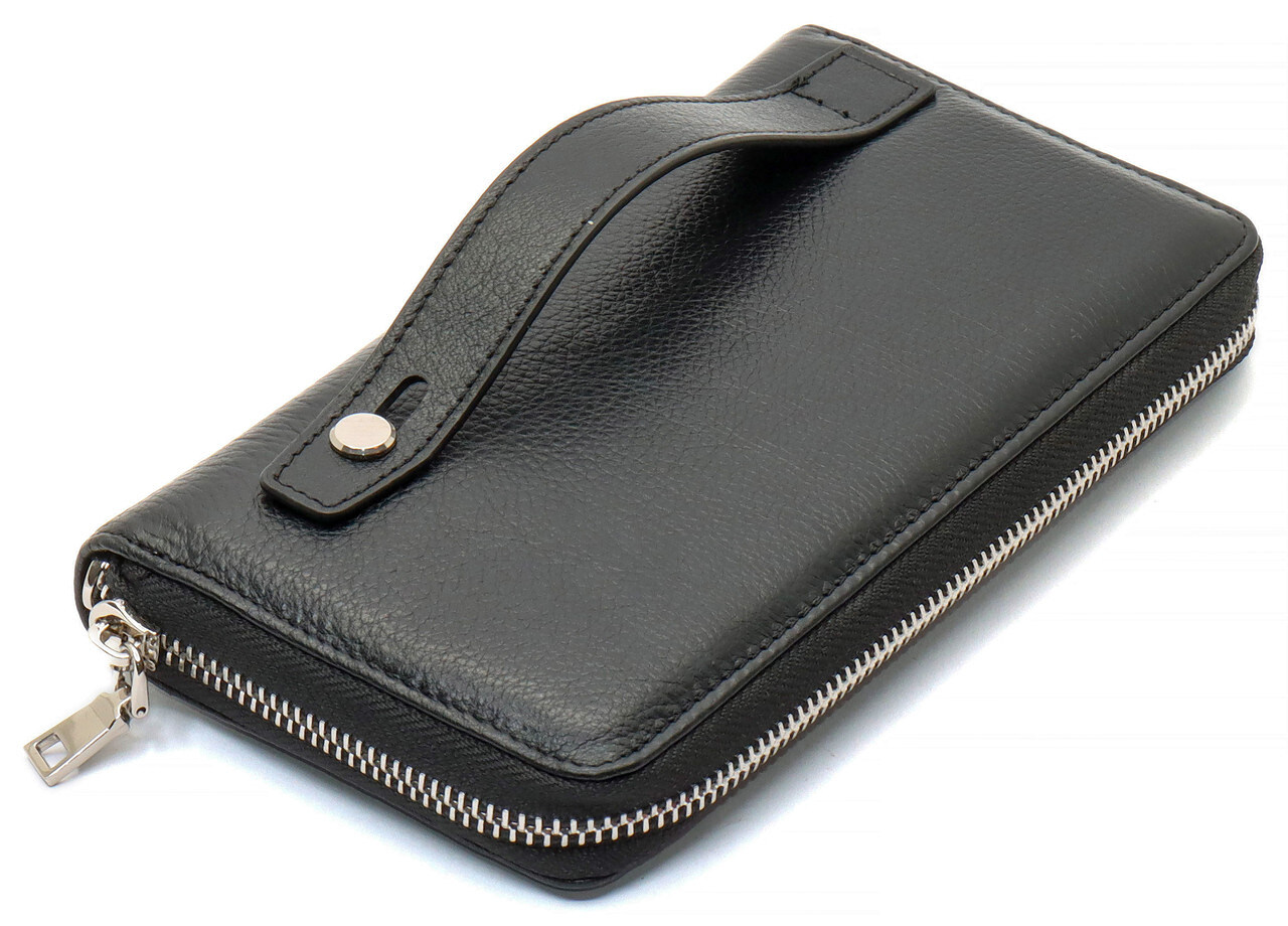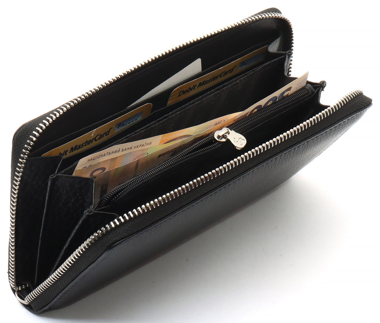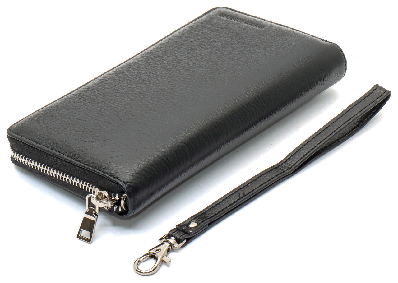 Мужской кошелек оснащен ремешком для ношения на ладони, а также ремнем на запястье. Такое решение позволяет использовать аксессуар как клатч, так и портмоне. Модель отличается особой вместительностью, поскольку имеет три отделения для банкнот. Они разделяются двумя карманами-перегородками. При этом один из них закрывается змейкой, чтобы в нем можно было носить мелочь. Кредитки размещаются на стенках кожаного мужского кошелька, что дает возможность их быстро вынимать. Изделие выполнено из прочной натуральной кожи с фактурной поверхностью, которая идеально сочетается с металлической молнией.