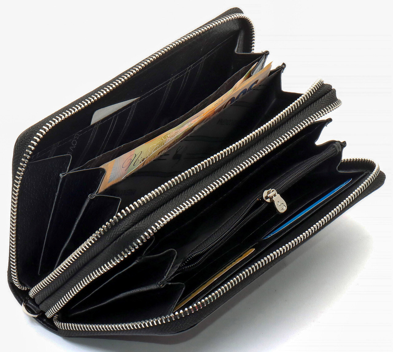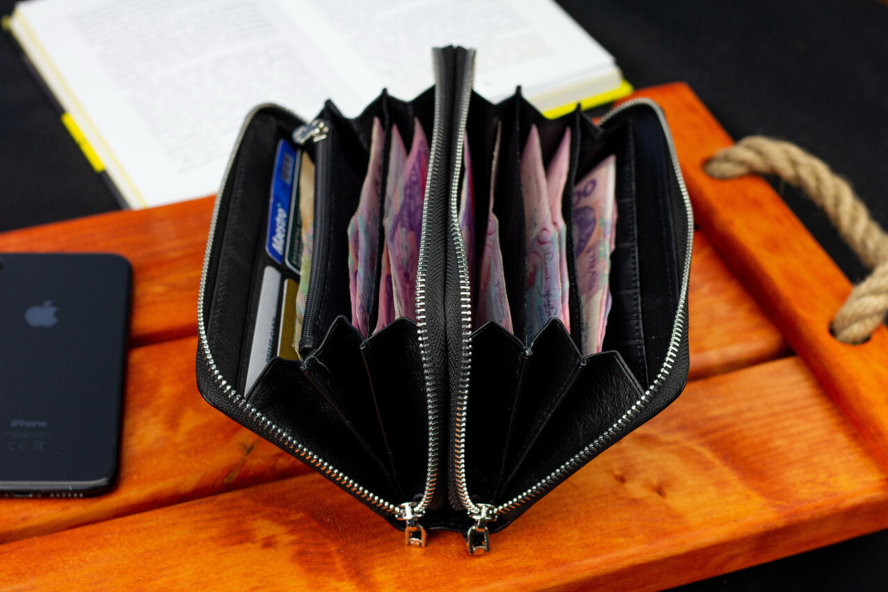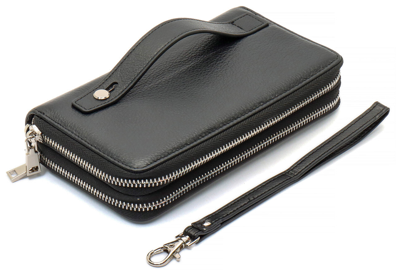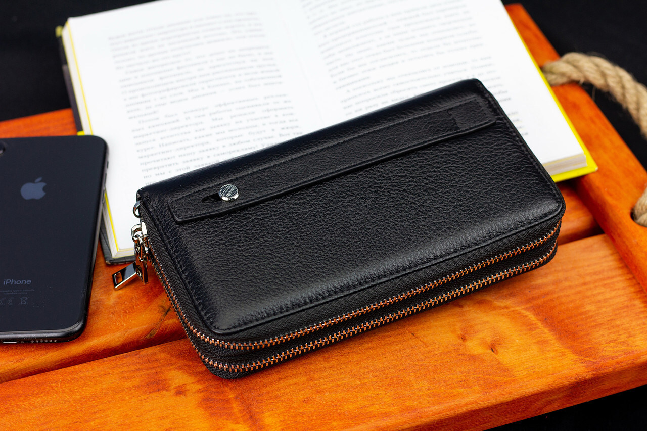 Мужской кошелек с двумя раздельными отделениями станет идеальным решением для тех, кто распоряжается большими суммами денег. В каждой части находится по три вместительных секции для купюр. Вдобавок в одной из них есть карман-перегородка на молнии, в котором удобно хранить монеты. Местом для кредитных карточек служат ячейки на стенках кожаного мужского кошелька. Носить изделие очень удобно, поскольку в нем предусмотрен ремень на ладонь, а также съемный ремешок на запястье.