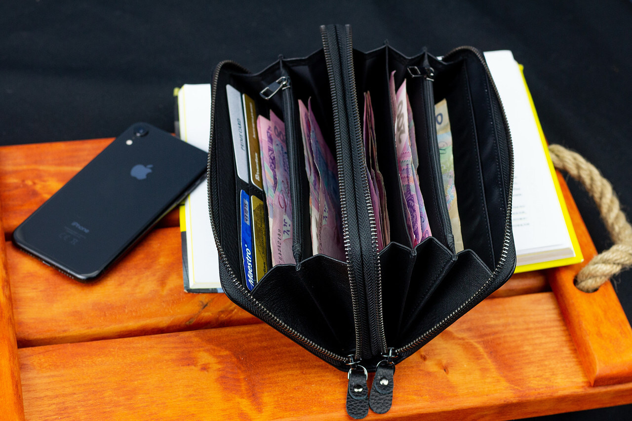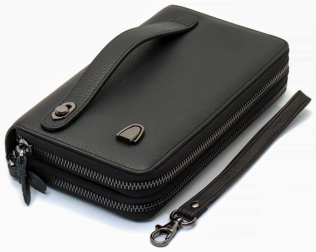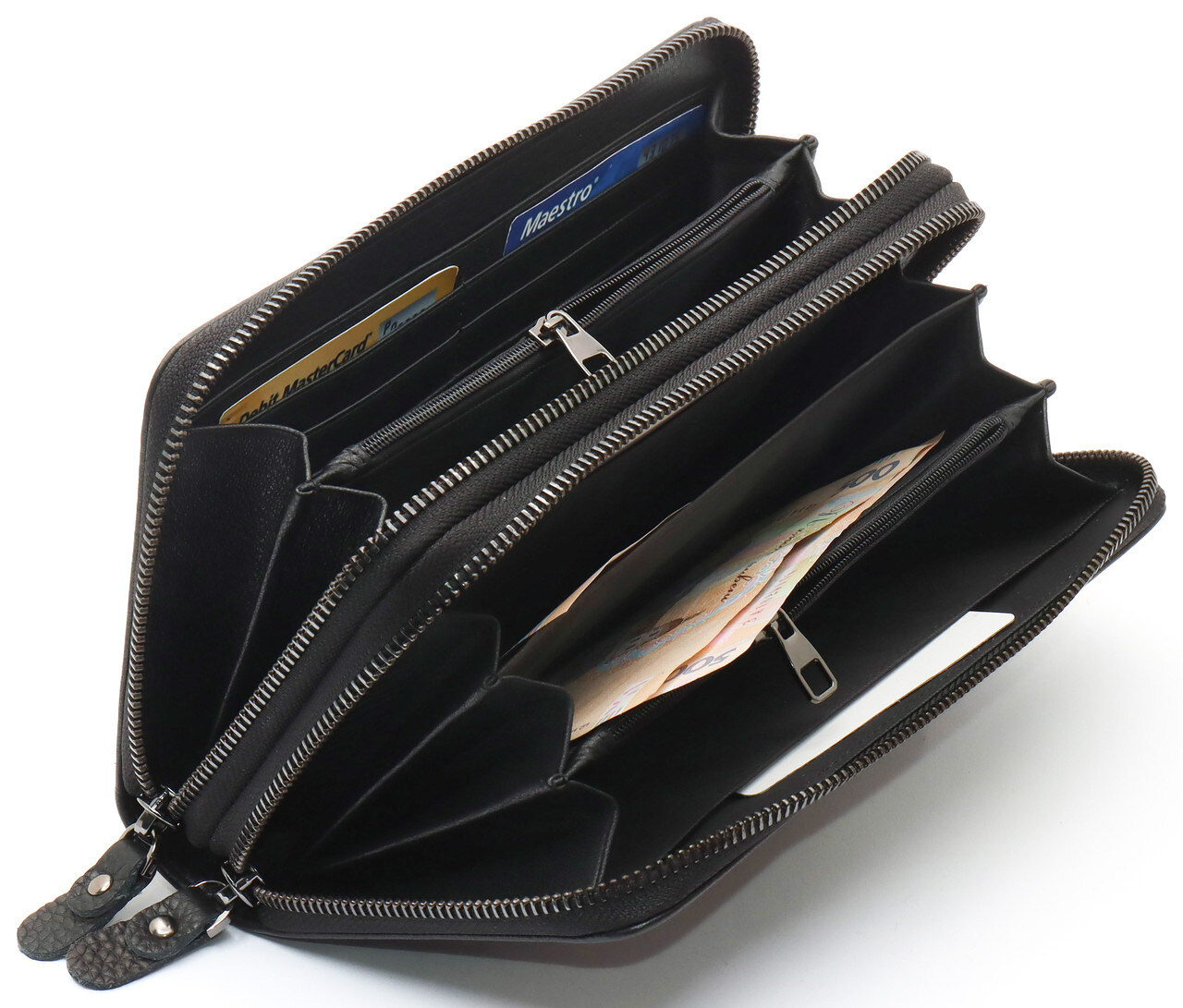 Мужской кошелек из натуральной кожи подойдет тем, кто одновременно ценит и стиль, и практичность. Модель имеет два раздельных отделения на молнии. Как в одном, так и во втором удобно держать банкноты, а также распределять их по номиналу. Дополнительные суммы (или чеки) можно откладывать в прилегающих карманах. Для монет подходят карманы на молнии, служащие перегородками. Кредитные карты в этом кожаном мужском кошельке хранятся в отдельном блоке, состоящем из 18 ячеек. Вдобавок там есть фиксатор для ручки. Благодаря двум ремням (на ладонь и запястье) аксессуар превращается либо в портмоне, либо в клатч.