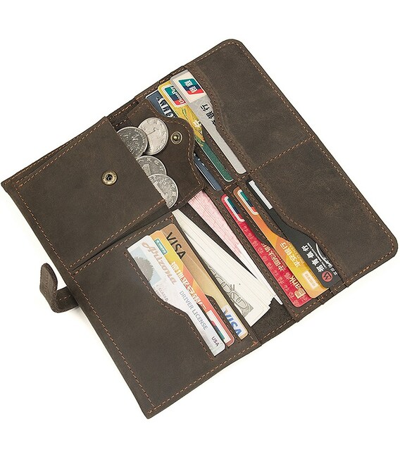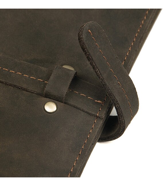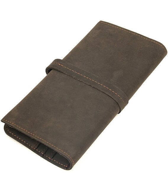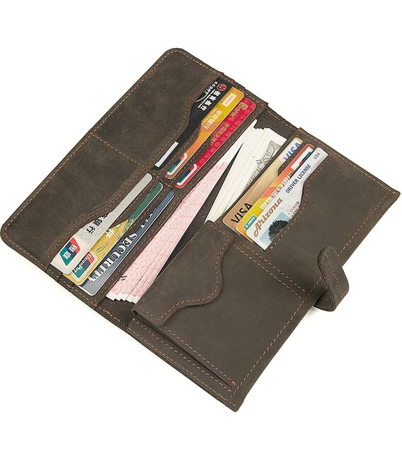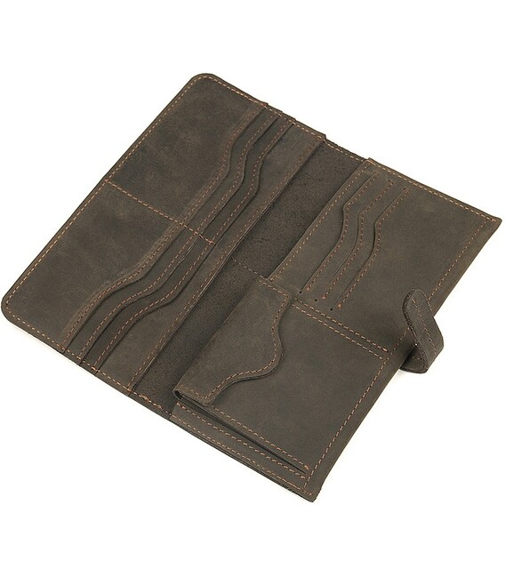 Стильный красивый мужской кошелек с винтажной кожи, которая очень популярна в этом сезоне. Такая кожа отличается неоднородной фактурой и потертостями, которые придают ей уникальный и неповторимый стиль. Кошелек надежно прошит коричневой нитью. Аксессуар поставляется в текстильном пылезащитном мешочке белого цвета.