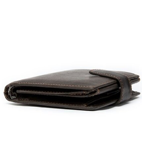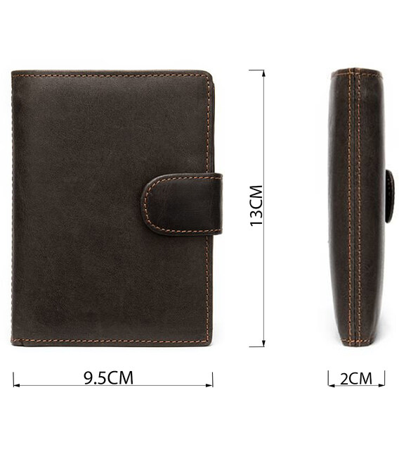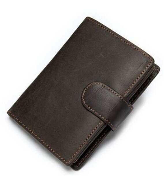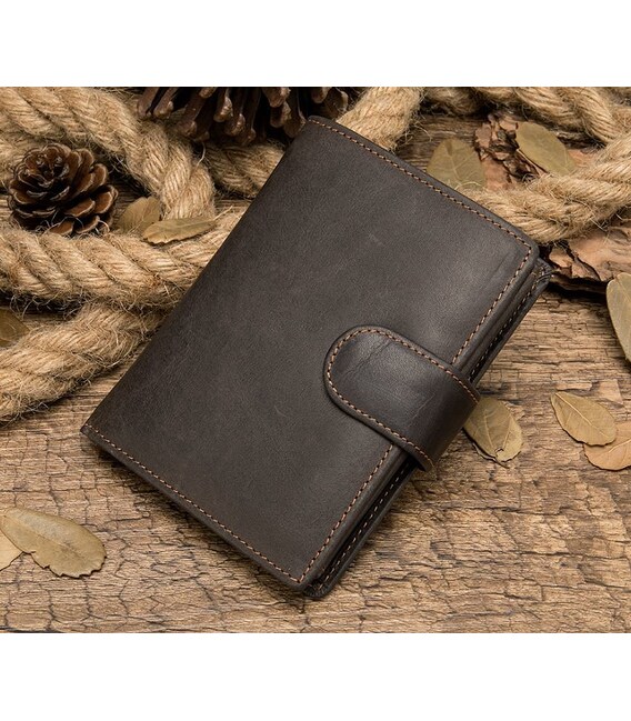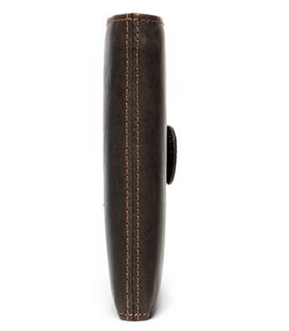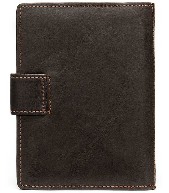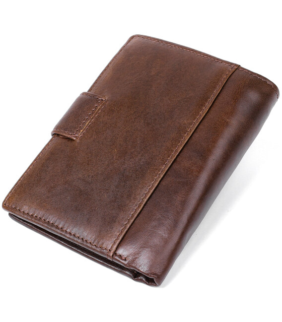 Многофункциональный кошелек в винтажном стиле. Аксессуар закрывается на хлястик с кнопкой и имеет стильный дизайн. По краям модель прошита рыжей нитью. Портмоне выполнено из плотной кожи, приятной на ощупь. Аксессуар очень вместительный. Будет отличным вариантом для подарка.