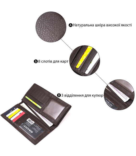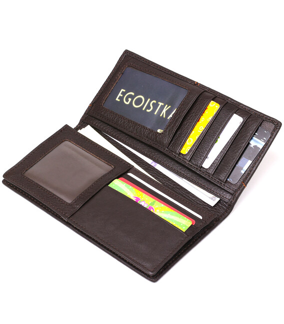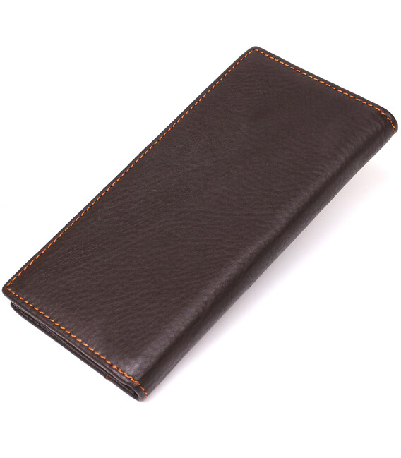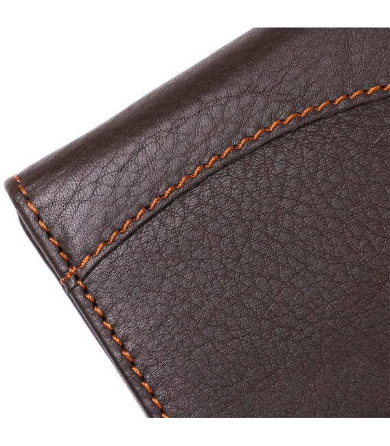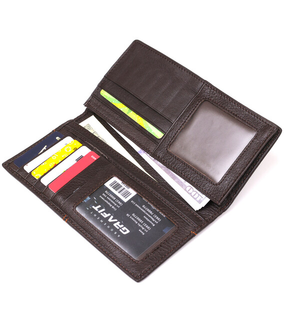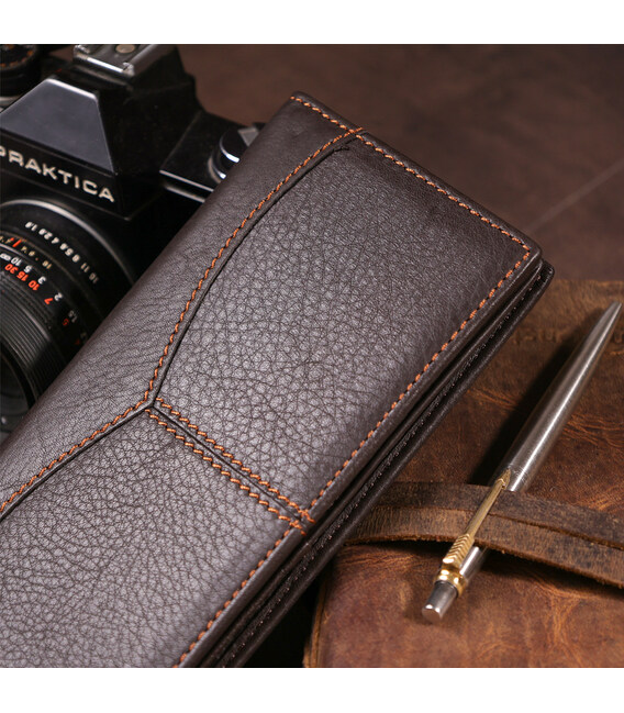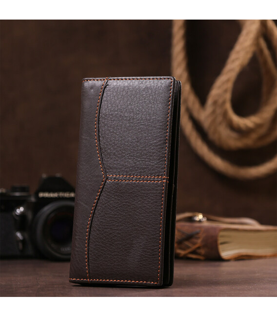 Материал: натуральная кожа; Цвет: коричневый; Размеры (ШхВ, см): 8,5х18. Страна производства: Китай. Особенности: - 3 отделения для банкнот; - 8 отделений для карточек; - 2 отделения для прав под пленкой; - потайное отделение на молнии. Современный тонкий мужской купюрник из натуральной высококачественной кожи мягкой и приятной на ощупь. По краям бумажник прошит светлой и крепкой нитью. Аксессуар упакован в текстильный пылезащитный чехол. Модель очень тонкая и практичная и будет носиться сравнительно долго. Данный бумажник станет прекрасным подарком для любого мужчины.