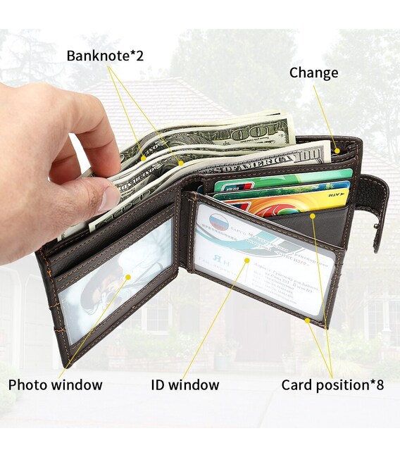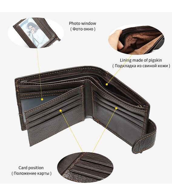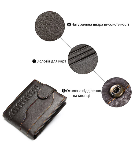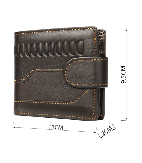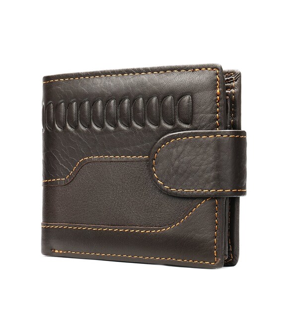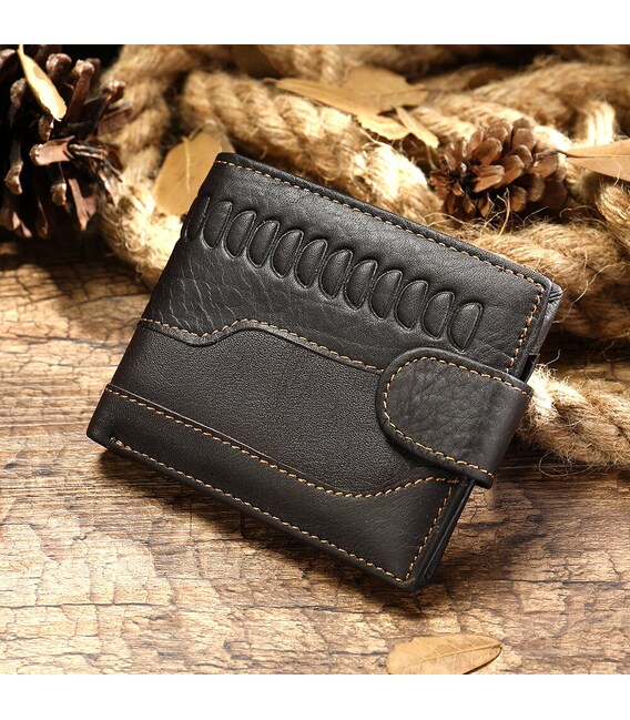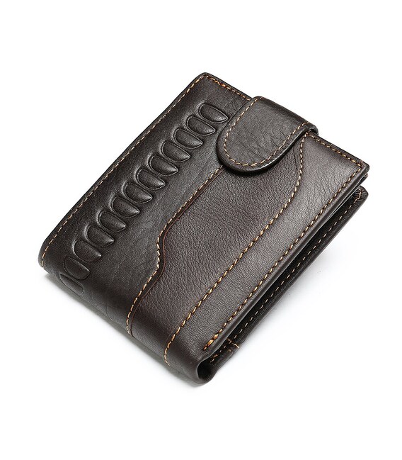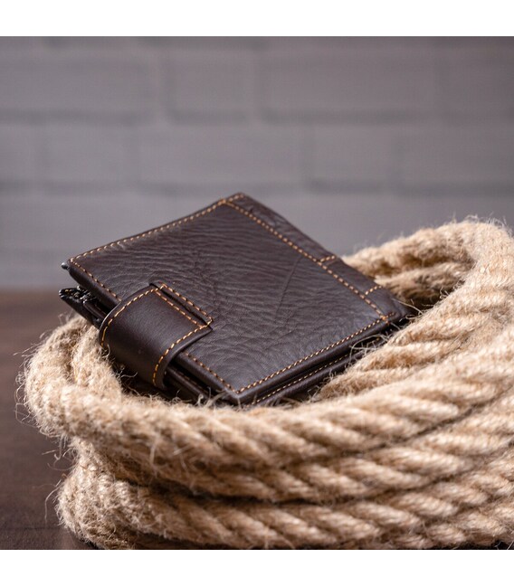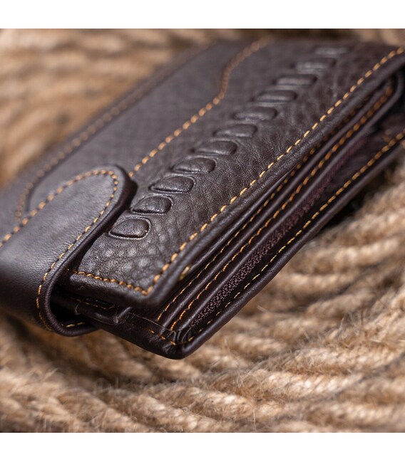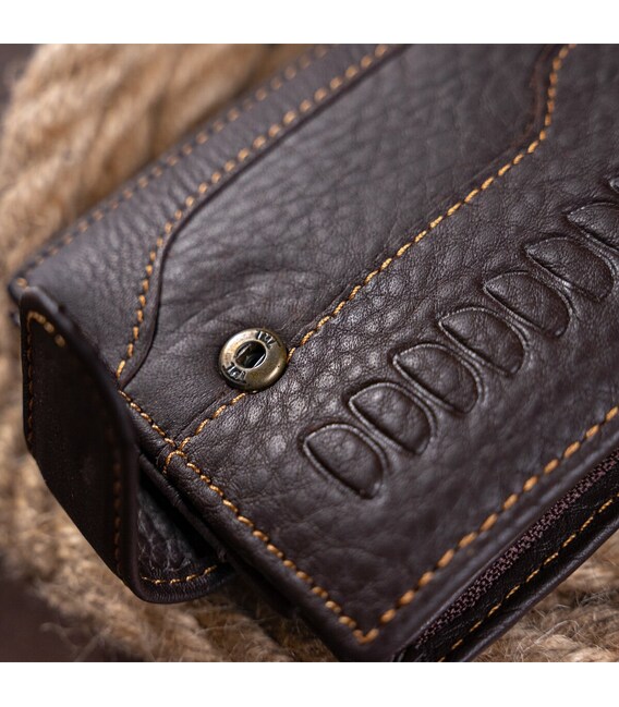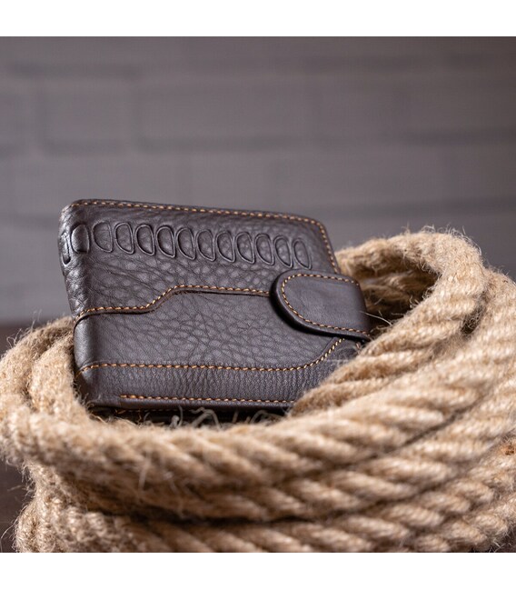 Функциональный и стильный кошелек для мужчин с тиснением. Аксессуар из натуральной кожи. Компактный кошелек легко поместится в вашу сумку или карман. По краям модель прошита светлой нитью. Изделие закрывается на кожаный хлястик с кнопкой. Кошелек прекрасно подойдет на подарок для мужчин.