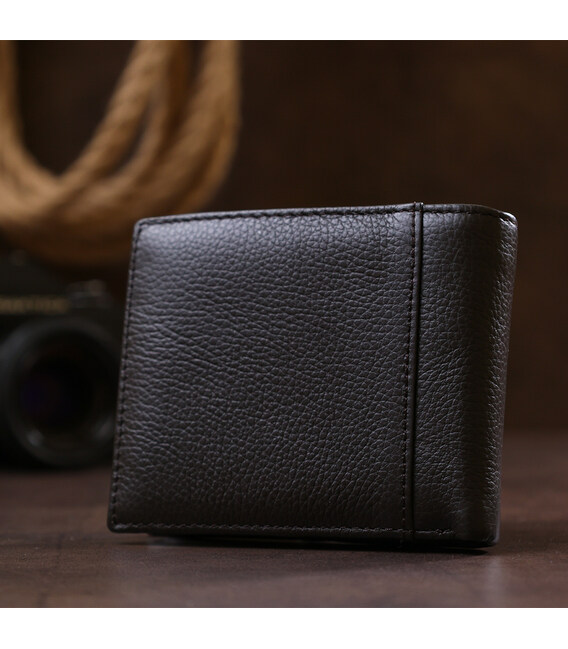 Добротный мужской кошелек из высококачественной кожи с повышенными показателями износоустойчивости. Внутреннее наполнение представлено в виде отделений для купюр, слотов для различных карточек, кармашек для удостоверения и компактной монетницы на кнопке. Портмоне выполнено в красивом коричневом цвете и имеет матовую фактуру.