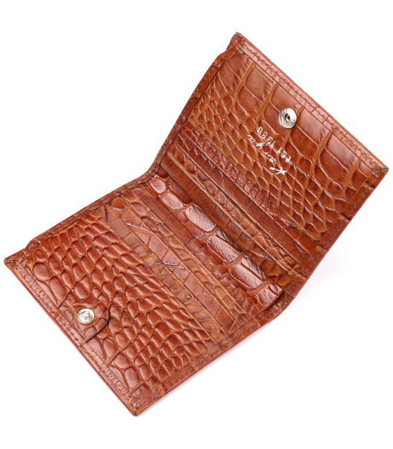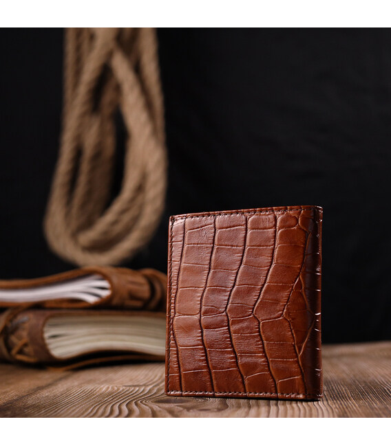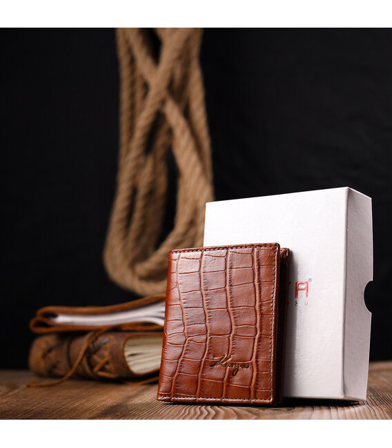 Компактный мужской кошелек из натуральной кожи с тиснением под рептилию, в коричневом цвете. Изделия закрывается на кнопку. Аксессуар упакован в фирменную коробочку. Изделия из натуральной кожи всегда будут отличным подарком для близкого человека.