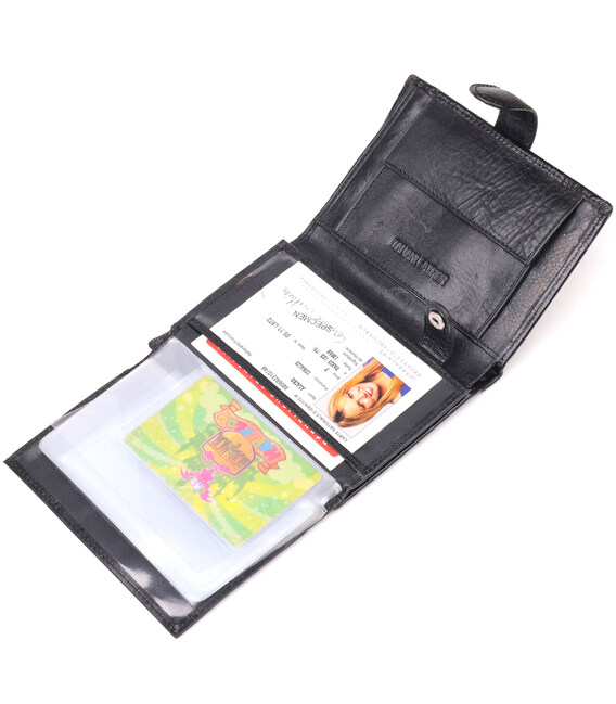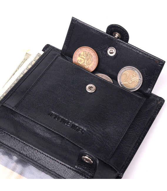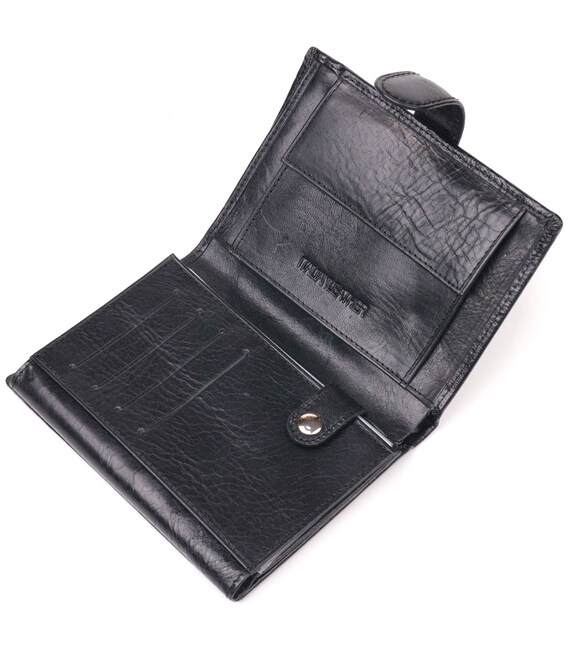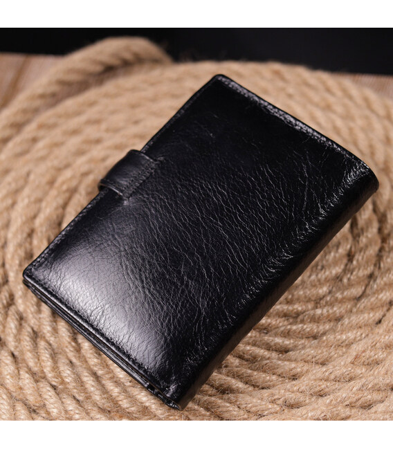 Практичный мужской бумажник черного цвета из натуральной качественной кожи. Для перегородки между отделениями используется натуральная кожа и прочный текстиль. Изделие состоит из двух больших отделений для купюр, восьми слотов для карточек, прозрачного отделения, монетницы, что закрывается клапаном на кнопку, а также блока для документов, что закрывается хлястиком на кнопку. Продается бумажник в красивой коробке от производителя.