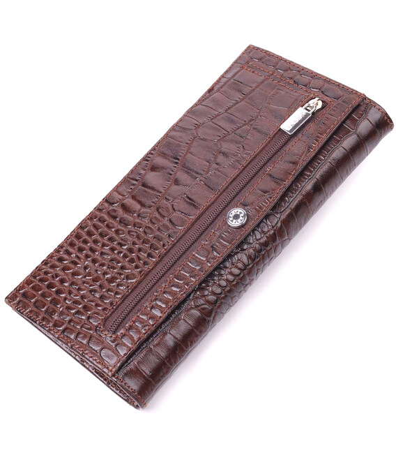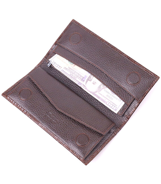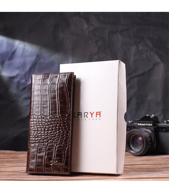 Описание Интересный вертикальный бумажник из натуральной фактурной кожи KARYA 21434 Коричневый