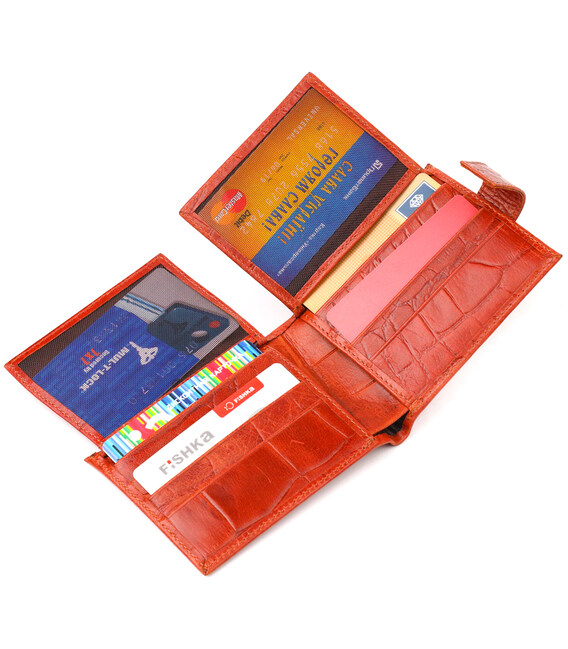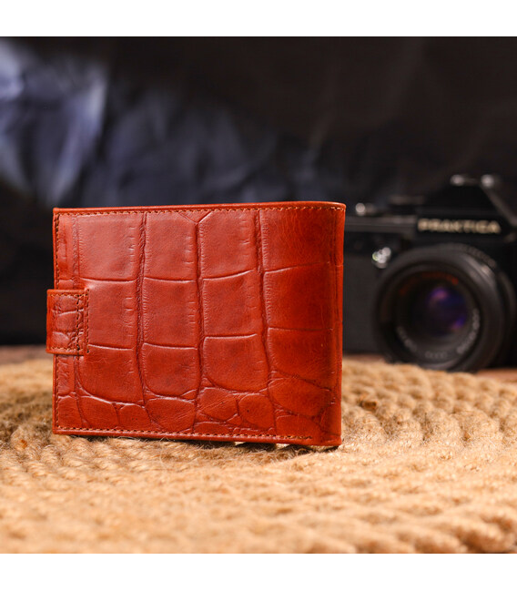 Красивое мужское портмоне, из натуральной фактурной кожи, с тиснением под крокодила. Аксессуар имеет одно основное отделение с перегородкой, в которое помещаются купюры всех номиналов, двенадцать карманов для карточек, четыре из которых под сеточкой. Закрывается аксессуар хлястиком на кнопку. Цвет фурнитуры – серебро. Вы легко сможете поместить его в карман брюк или маленькую сумку. Упакован бумажник картонную коробку. Кожаный кошелек является отменным подарком для родных и близких людей.