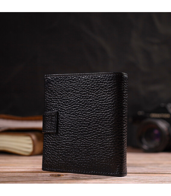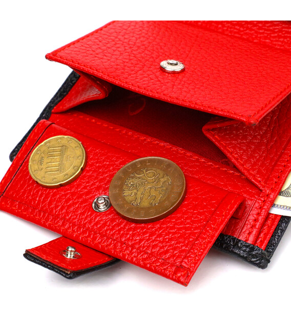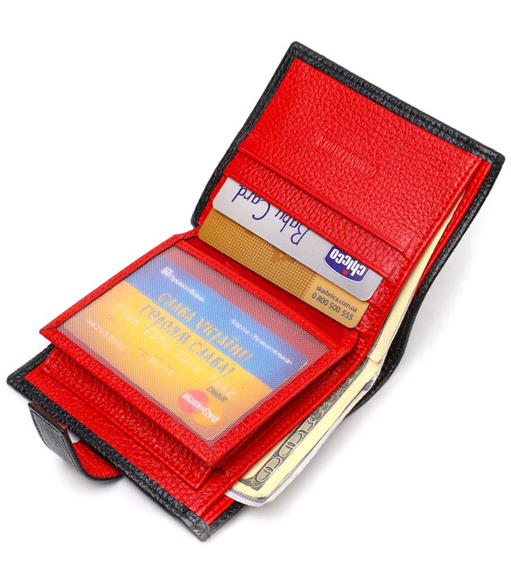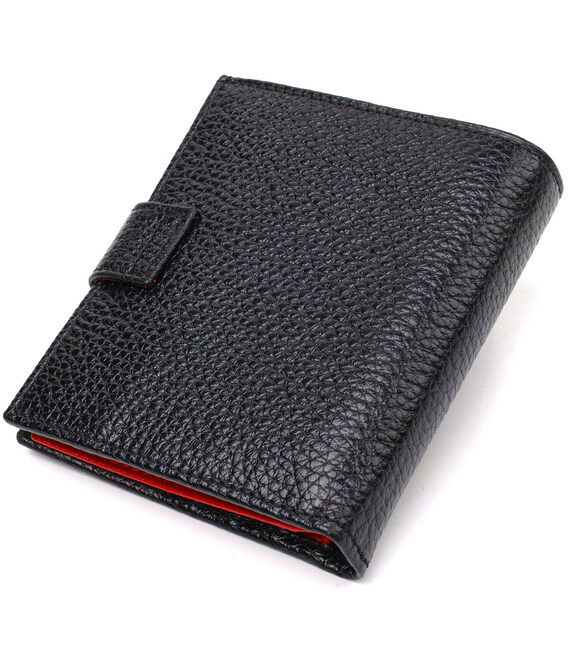 Компактный мужской кошелек из натуральной зернистой кожи вертикального формата, черного цвета снаружи и красного внутри. Аксессуар имеет основное отделения с перегородкой, пять отсеков для карточек, два прилегающих кармана, прозрачный карман для документов и монетницу. Закрывается аксессуар хлястиком на кнопку. Отличный аксессуар от надежного производителя, который прослужит очень долго.