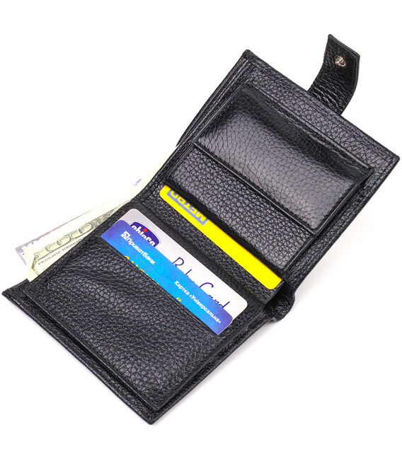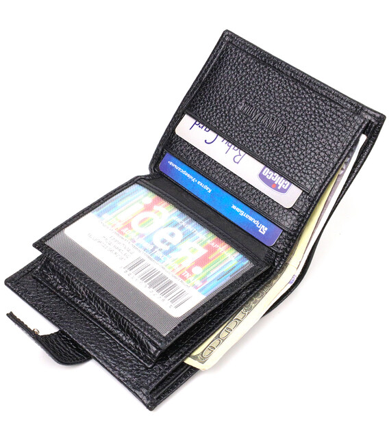 Стильный компактный мужской кошелек из натуральной зернистой кожи. Аксессуар имеет основное отделения с перегородкой, пять отсеков для карточек, два прилегающих кармана, прозрачный карман для документов и монетницу. Закрывается аксессуар хлястиком на кнопку. Отличный аксессуар от надежного производителя, который прослужит очень долго.