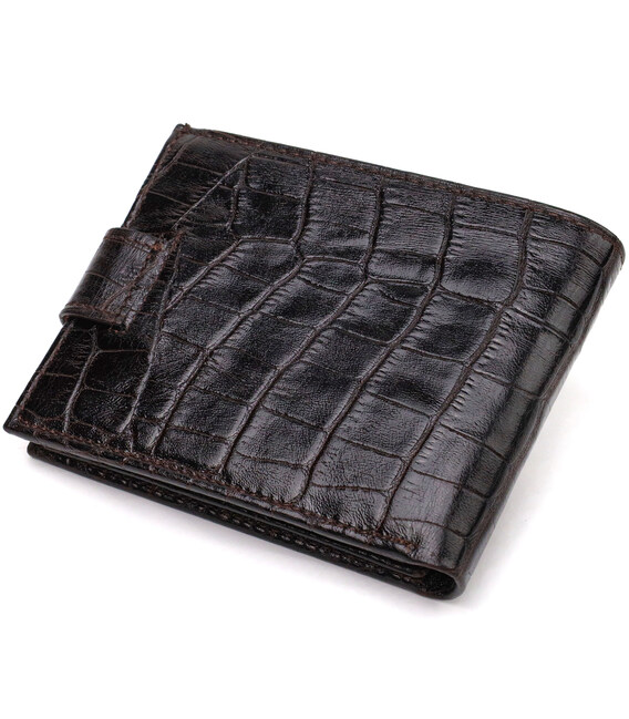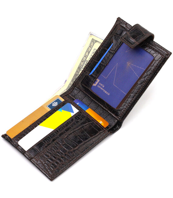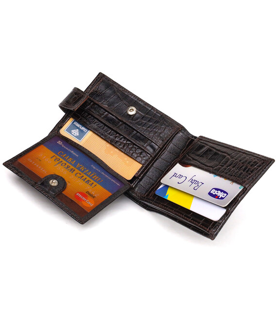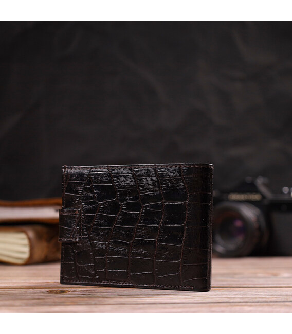 Модный мужской кошелек, из натуральной фактурной кожи, с тиснением под крокодила. Аксессуар имеет одно основное отделение с перегородкой, в которое помещаются купюры всех номиналов, девять карманов для карточек, два из которых под сеточкой, монетница и два прилегающих кармана. Закрывается аксессуар хлястиком на кнопку. Цвет фурнитуры – серебро. Вы легко сможете поместить его в карман брюк или маленькую сумку. Упакован бумажник картонную коробку. Кожаный кошелек является отменным подарком для родных и близких людей.