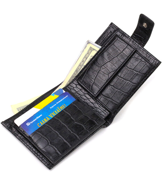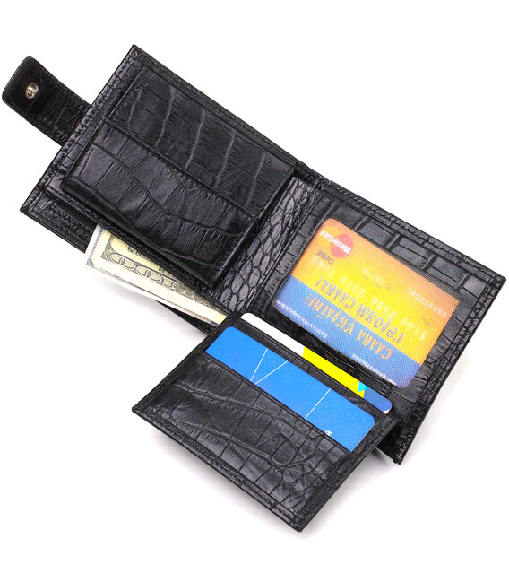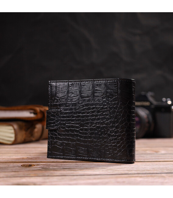 Функциональное мужское портмоне из натуральной фактурной кожи с тиснением под крокодила. Аксессуар имеет одно основное отделение с карманом-перегородкой, в которое помещаются купюры всех номиналов, шесть карманов для карточек, карман под сеточкой для документов и монетницу. Закрывается аксессуар пополам кожаным хлястиком на кнопку. Упакован бумажник картонную коробку.