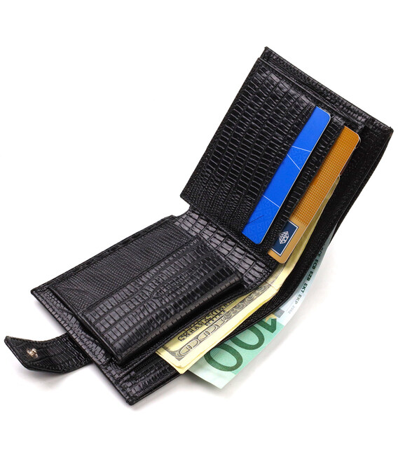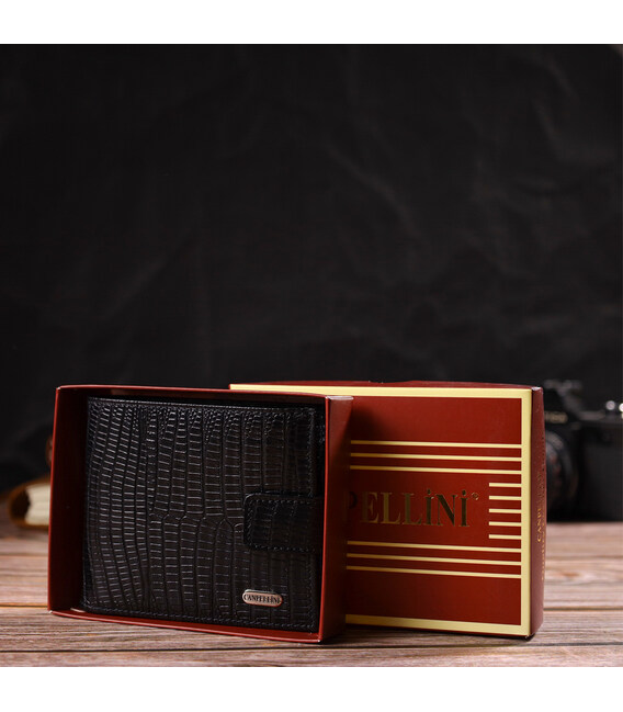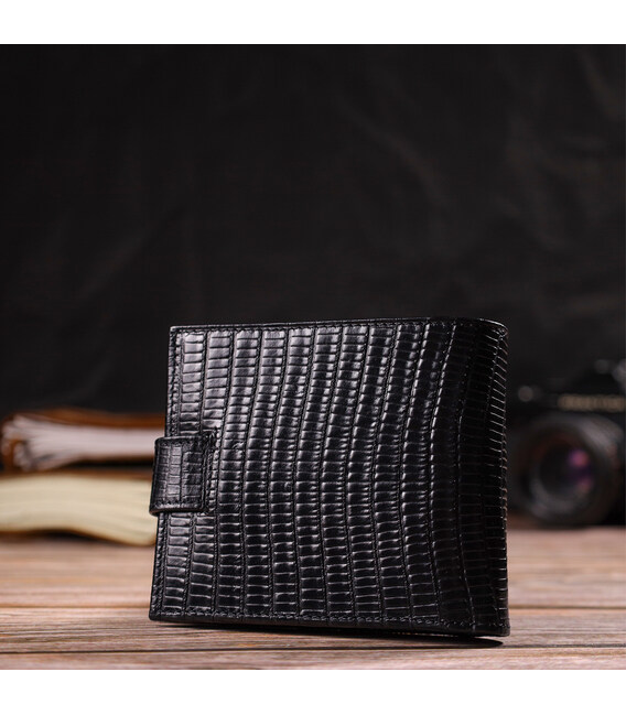 Практичное мужское портмоне из натуральной фактурной кожи с тиснением. Аксессуар имеет одно основное отделение с карманом-перегородкой, в которое помещаются купюры всех номиналов, шесть карманов для карточек, карман под сеточкой для документов и монетницу. Закрывается аксессуар пополам кожаным хлястиком на кнопку. Упакован бумажник картонную коробку.