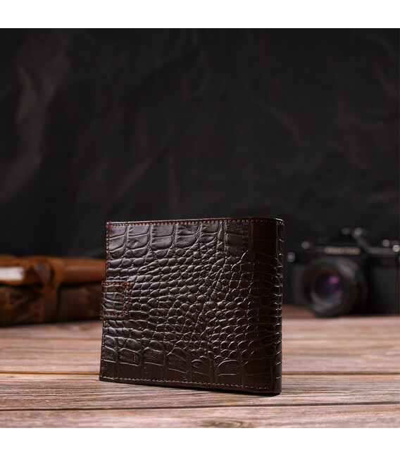 Модный мужской бумажник из натуральной кожи с тиснением под крокодила. Аксессуар имеет основное отделение для купюр, три ячейки для карточек, два кармана под сеточкой, карман на молнии через всю длину и монетницу, что закрывается клапаном на кнопку. Кошелек складывается пополам и закрывается хлястиком на кнопку. На лицевой стороне в правом нижнем углу, расположен металлический логотип компании производителя. Многофункциональный мужской бумажник из очень прочной кожи отличный выбор подарка для солидного мужчины.