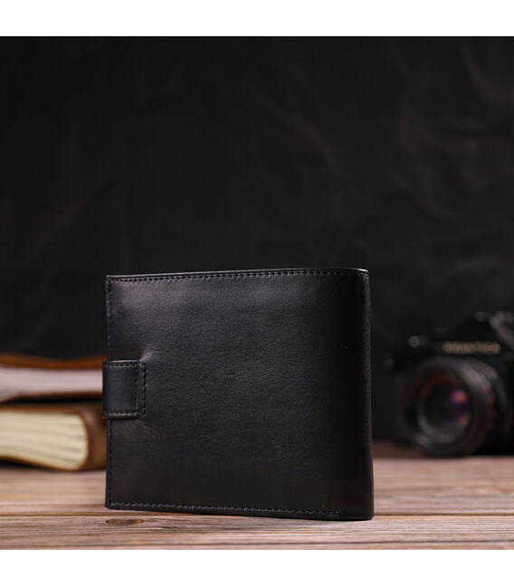 Классический мужской бумажник из натуральной гладкой кожи. Аксессуар имеет основное отделение для купюр, три ячейки для карточек, два кармана под сеточкой, карман на молнии через всю длину и монетницу, что закрывается клапаном на кнопку. Кошелек складывается пополам и закрывается хлястиком на кнопку. На лицевой стороне в правом нижнем углу, расположен металлический логотип компании производителя. Многофункциональный мужской бумажник из очень прочной кожи отличный выбор подарка для солидного мужчины.