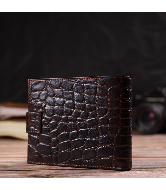 Интересный мужской кошелек среднего размера из натуральной фактурной кожи с тиснением под крокодила. Аксессуар имеет основное отделение для купюр с перегородкой, четыре ячейки для карточек, два кармана под сеточкой, три прилегающих кармана и монетницу. Кошелек складывается пополам, закрывается хлястиком на кнопку. На лицевой стороне в правом нижнем углу, расположен металлический логотип компании производителя. Покупая кожаный кошелек в нашем магазине, Вы получаете модный, стильный аксессуар, который прослужит не один год.