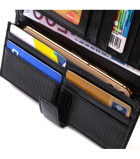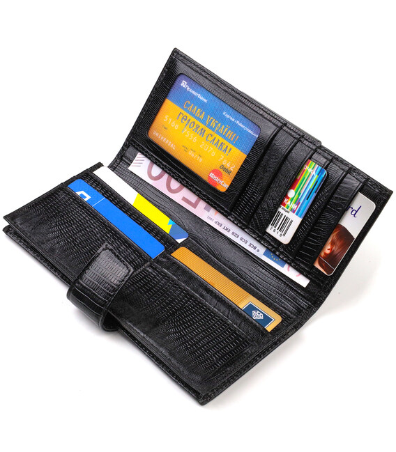 Практичный мужской кошелек из натуральной фактурной кожи с тиснением. Аксессуар имеет одно основное отделение для купюр всех номиналов, одиннадцать ячеек для карточек, карман под сеточкой для пропуска и два скрытых кармана. Закрывается аксессуар пополам хлястиком на кнопку. На лицевой стороне, в правом нижнем углу металлический логотип компании производителя. Приобретая кожаный аксессуар этой фирмы, себе или на подарок, будьте уверены, что он прослужит Вам не один год.