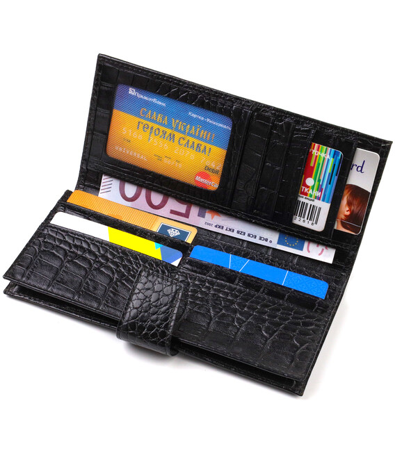 Современный мужской кошелек из натуральной фактурной кожи с тиснением под крокодила. Аксессуар имеет одно основное отделение для купюр всех номиналов, одиннадцать ячеек для карточек, карман под сеточкой для пропуска и два скрытых кармана. Закрывается аксессуар пополам хлястиком на кнопку. На лицевой стороне, в правом нижнем углу металлический логотип компании производителя. Приобретая кожаный аксессуар этой фирмы, себе или на подарок, будьте уверены, что он прослужит Вам не один год.