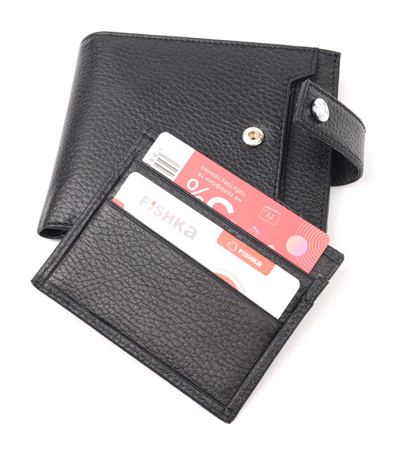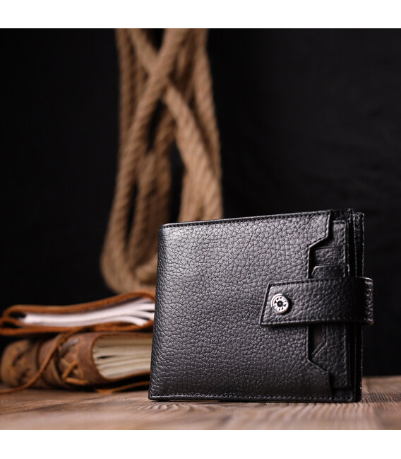 Отличный мужской кошелек из натуральной кожи, в классическом черном цвете. С наружной стороны находится карман с блоком под карточки и документы. Закрывается кошелек хлястиком с кнопкой. Обладает стандартным горизонтальным форматом, помещается в карман. Изделия из натуральной кожи всегда будут отличным подарком для близкого человека.