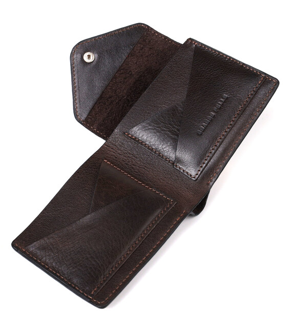 Стильное мужское горизонтальное портмоне, которое изготовлено только из натуральной кожи высочайшего качества, без тканевой подкладки. Изделие выполнено в гладкой коже, которое красиво переливается на солнце. Фишкой этого кошелька является треугольный клапан сверху, на который закрывается аксессуар. Данное портмоне идеальный вариант для современного человека, который предпочитает носить минимум наличных и выбирает карточки. Портмоне упаковано в фирменную коробку. Данное портмоне станет лучшим подарком для ваших близких.