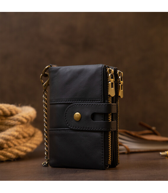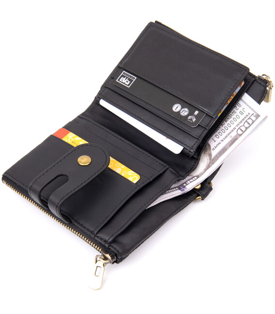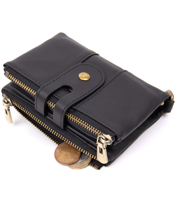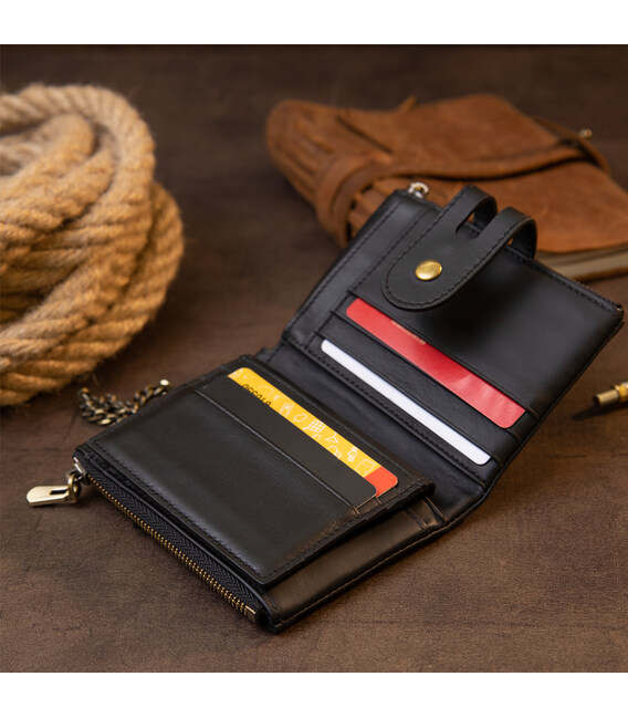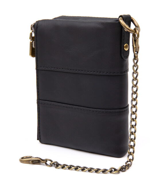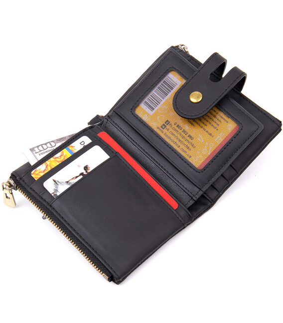 Компактный и очень функциональный кошелек из натуральной кожи в черном цвете. Уникальной особенностью такого кошелька является то, что вы сами можете регулировать объем наполненности кошелька. В аксессуаре 2 кнопочки. Огромный функционал впечатлит любого клиента. Кошелек совсем не прихотлив в использовании. И отлично носится годами. С таким функциональным кошельком вы точно ничего не забудете. Вы также можете носить кошелек на цепочке. Может быть прекрасным подарком для близкого человека.