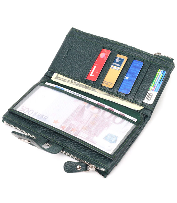 Функциональный женский кошелек, из натуральной зернистой кожи. Аксессуар имеет два широких основных отделения, в которые помещаются купюры всех номиналов, две монетницы, двадцать четыре кармана для карточек, два открытых кармана снаружи и одно прозрачное окошко для документов. Закрывается аксессуар хлястиком на кнопку. Если Вы хотите порадовать и себя и удивить близких, то непеременно покупайте кожаные аксессуары в нашем магазине, качество и цена Вас однозначно порадует.