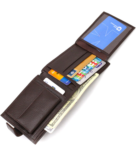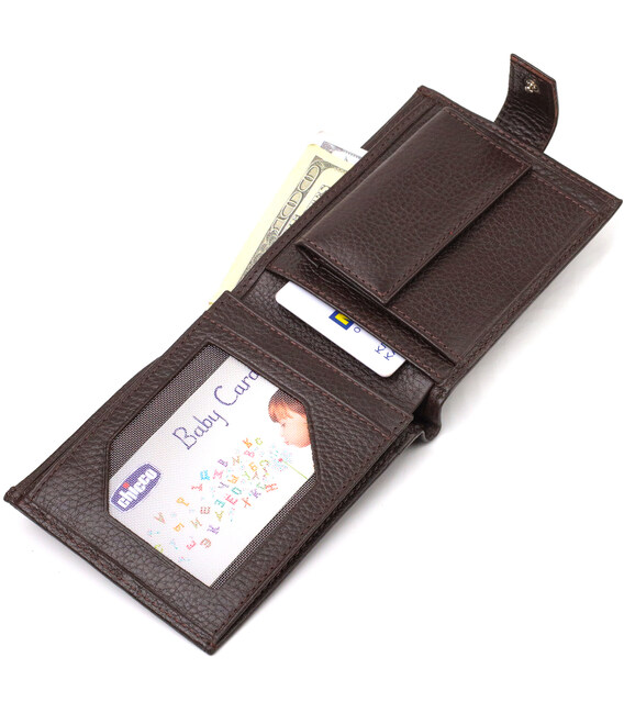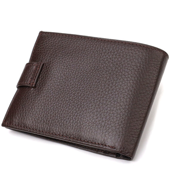 Надежный мужской кошелек среднего размера из натуральной зернистой кожи флотар. Аксессуар имеет основное отделение для купюр с перегородкой, четыре ячейки для карточек, два кармана под сеточкой, три прилегающих кармана и монетницу. Кошелек складывается пополам, закрывается хлястиком на кнопку. На лицевой стороне в правом нижнем углу, расположен металлический логотип компании производителя. Покупая кожаный кошелек в нашем магазине, Вы получаете модный, стильный аксессуар, который прослужит не один год.
