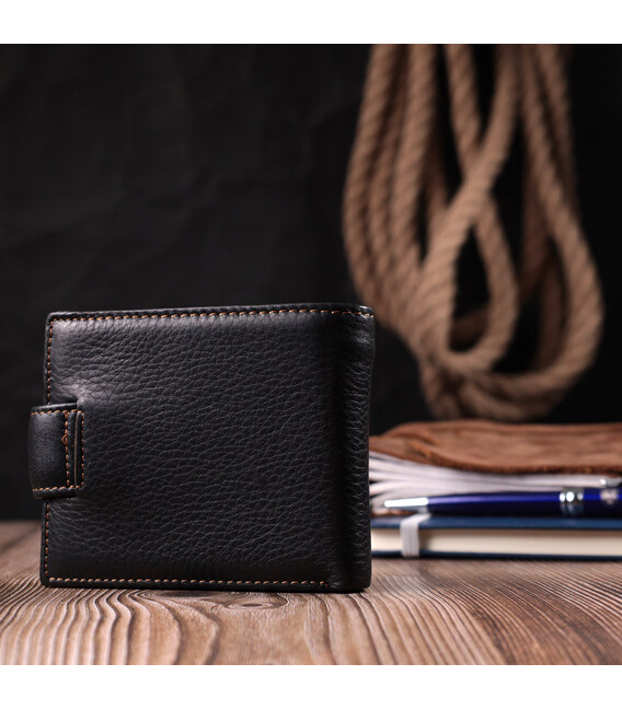 - мужской кошелек из натуральной кожи, что закрывается хлястиком на кнопку;