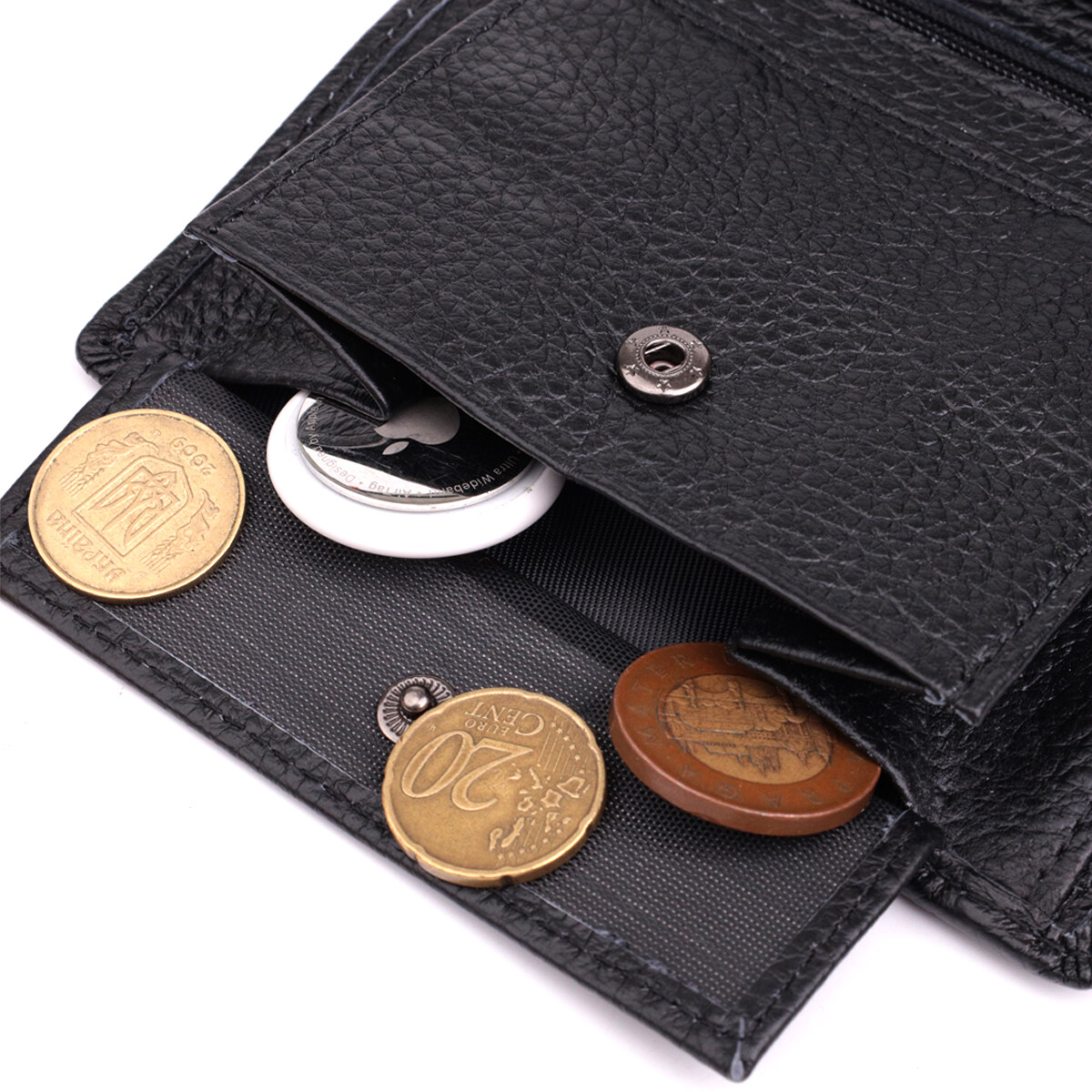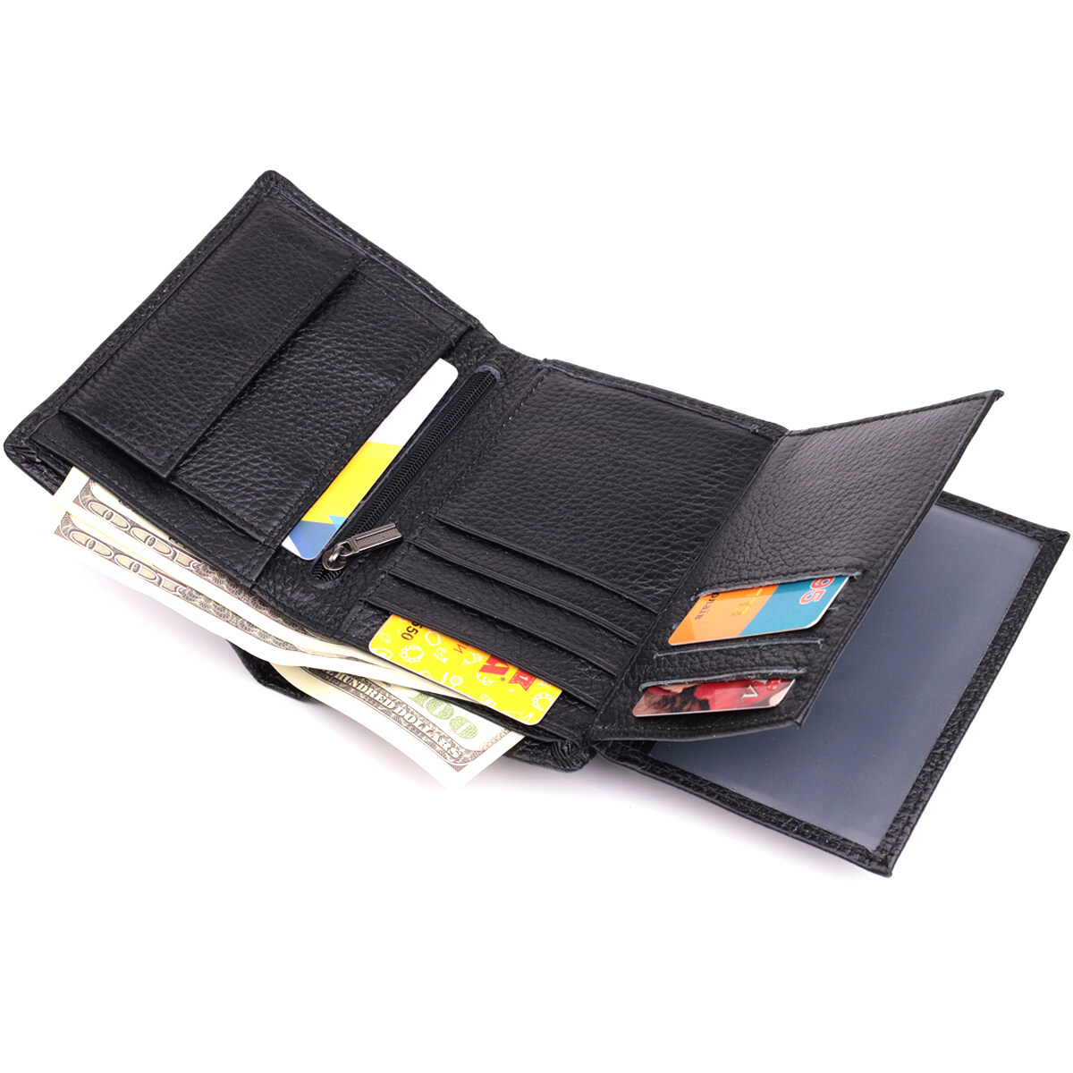Качественное кожаное портмоне с достаточным количеством ячеек для кредиток. В портмоне поместится достаточное количество купюр разного номинала, карточек и мелочи. Аксессуар выполнен в мягкой коже и в классическом черном цвете с простым и непринужденным дизайном. В комплекте идет пылезащитный чехол. Кожаный кошелек - лучший подарок как для себя, так и на подарок.