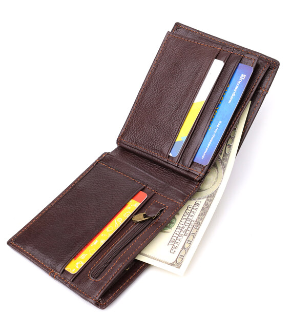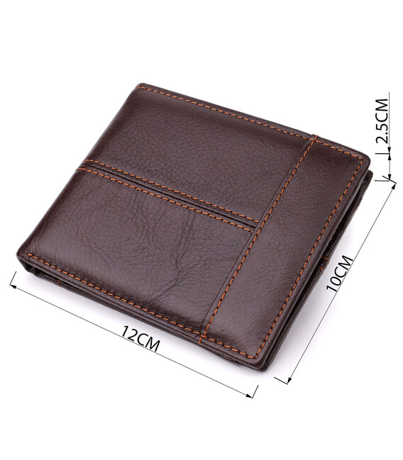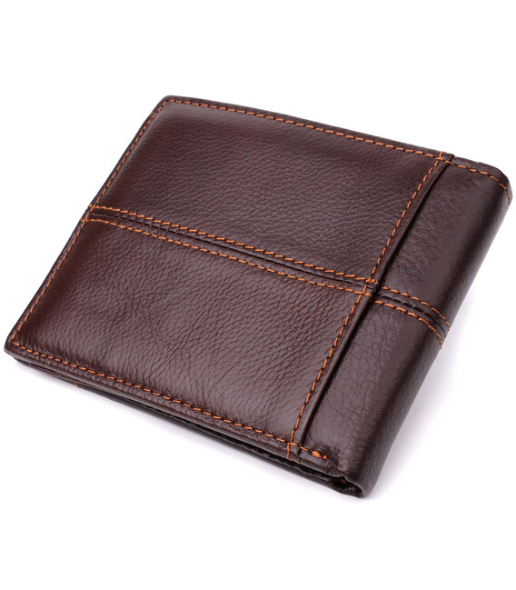 Качественный мужской бумажник, выполненный из натуральной кожи премиального качества. Аксессуар аккуратно прошит сверхпрочной коричневой нитью, что придаёт изделию дополнительную прочность и подчёркивает его элегантный внешний вид. Бумажник приятный на ощупь, с продуманной до мелочей внутренней организацией. Компактный и удобный, он легко помещается в карман или сумку, обеспечивая быстрый доступ ко всем необходимым вещам. Модель складывается пополам и не имеет застёжки, что делает использование ещё более удобным и практичным. Внутри гармонично сочетаются элементы из натуральной кожи и плотного текстиля, что увеличивает срок службы аксессуара. Бумажник поставляется в белом текстильном пылезащитном чехле, что делает его отличным вариантом для подарка.
