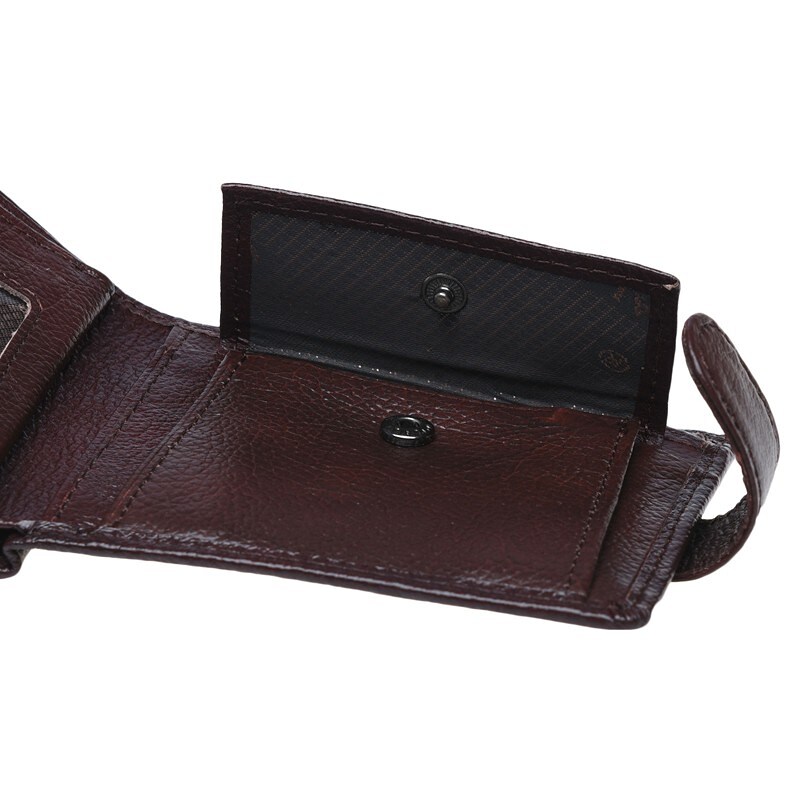 Современная модель кошелька в коричневой коже- удачное и модное приобретение для мужчины. Закрывается на кнопку. Имеет 3 отделения под купюры, 1 монетницу, 7 отделов под карты. Подкладка- текстиль. Цвет фурнитуры- серебро.