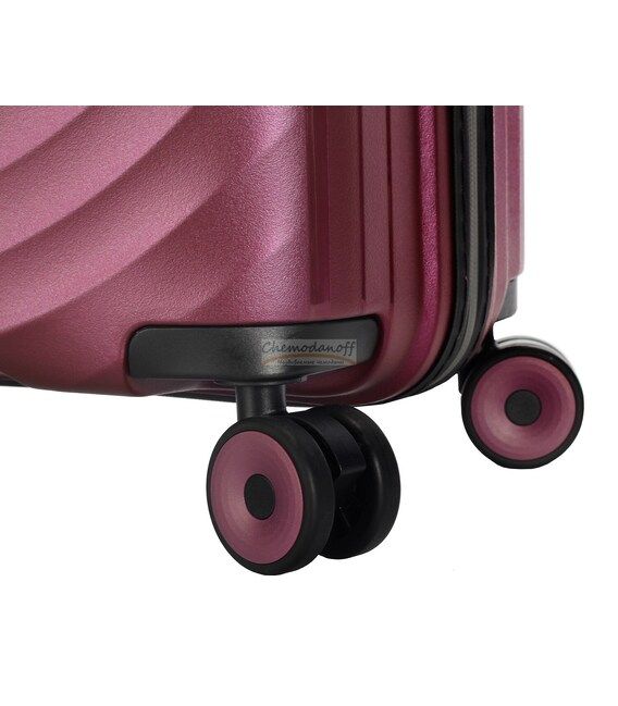 Бесшумное и плавное перемещение обеспечивают полиуретановые колеса на подшипниках, вращающиеся на 360 град, придавая чемоданам дополнительную манёвренность и давая возможность перемещать его в вертикальном положении.