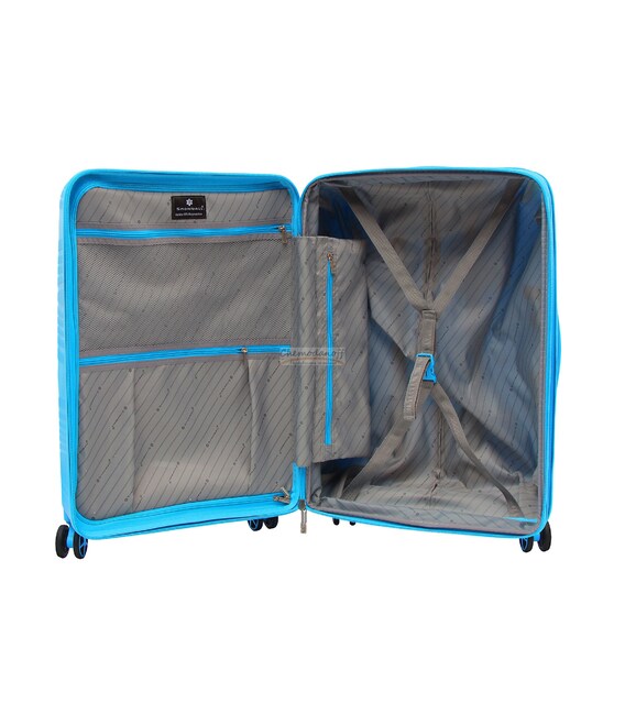 Внутри чемоданов имеется 2 отделения, одно с внутренними ремнями крепления багажа, другое закрывается на молнию.