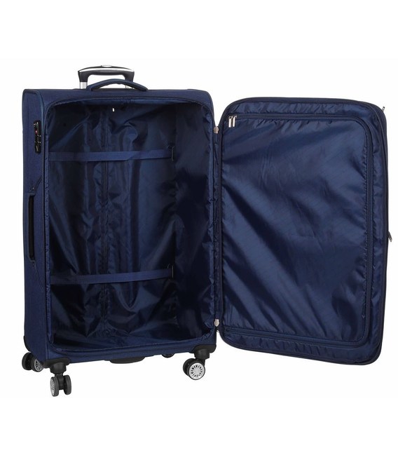 Внутри чемоданов одно отделение с внутренними ремнями крепления багажа и закрывается на молнию.