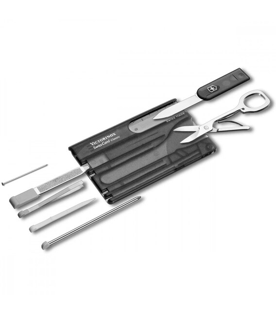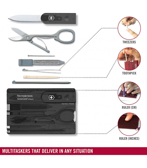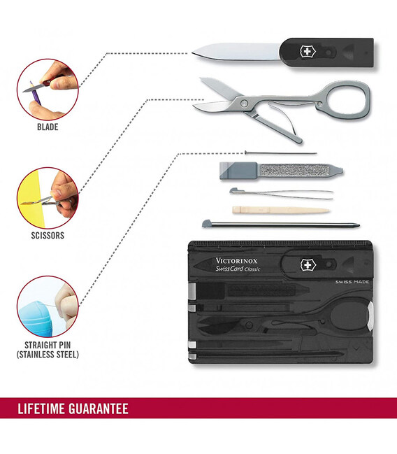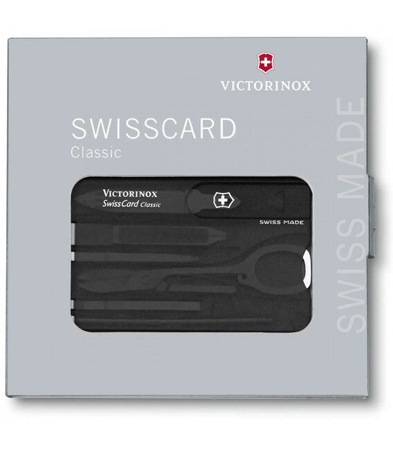 SWISS CARD CLASSIC (черный) от Victorinox - компактный, многозадачный набор в виде банковской карты на 10 функций. Функциональная Швейцарская карта, чтобы носить с собой в кошельке, кармане или рюкзаке.С таким набором в комплектации Swiss Card Classic вы искренне удивитесь, как обходились раньше без швейцарской карты. Благодаря продуманному, отмеченному наградами дизайну и невероятной функциональности вы будете получать удовольствие каждый раз, когда вам понадобится воспользоваться каким-либо из инструментов: записать что-то на ходу, привести в порядок маникюр или достать занозу.Информация о Swiss Card Classic (0.7133.T3)✔ Количество функций: 10.✔ Черный полупрозрачный корпус-органайзер.✔ Инструменты из первоклассной нержавеющей стали.✔ Размер карты (Д х Ш х Т): 82 х 55 х 4 мм✔ Вес набора: 26 г✔ Сделано в Швейцарии.✔ Упаковка: картонная коробочка.1. небольшое лезвие (нож для писем)2. ножницы3. маленькая шариковая ручка4. пилочка для ногтей +5. - отвертка 2,5 мм на кончике6. булавка7. линейка в см (разметка на корпусе карты)8. линейка в дюймах9. пинцет10. зубочистка