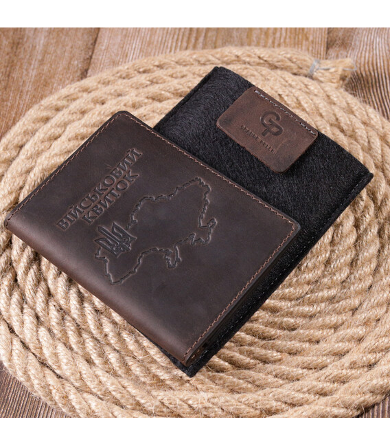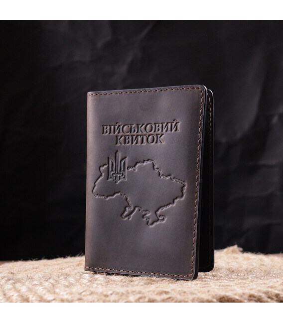 Качественная обложка коричневого цвета для военного билета с патриотическим тиснением карты Украины, на лицевой стороне. Изделие пошито с качественной винтажной итальянской кожи с высоким показателем износостойкости, которая защитит от повреждений документ на очень долгое время. Аксессуар имеет разворот для военного билета, две ячейки для карточек, без застежки, упакован в фирменный чехол.