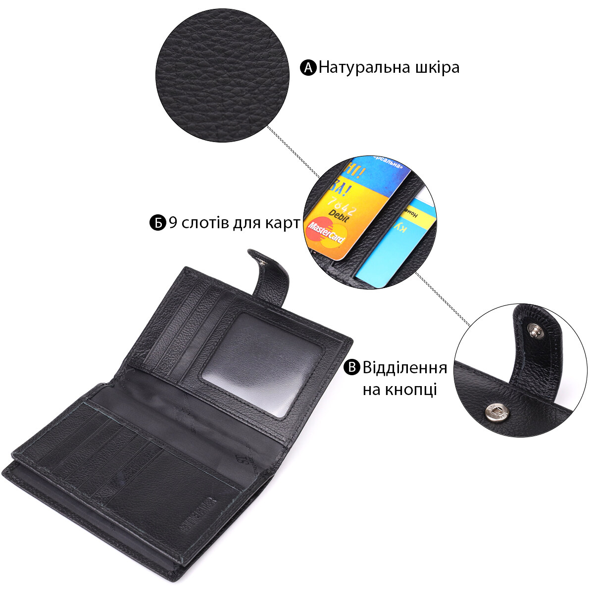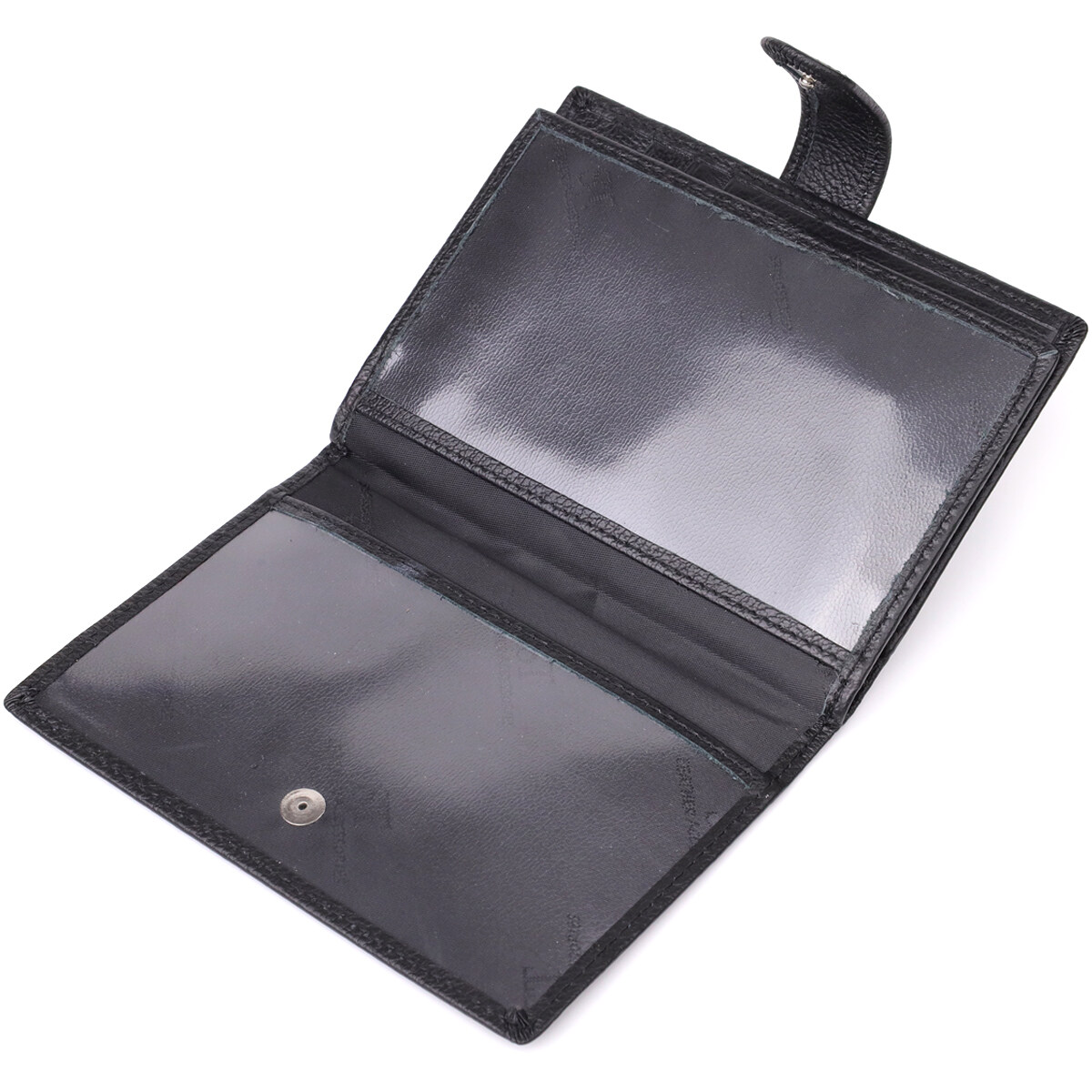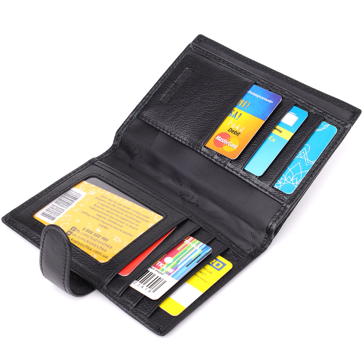 Обложка для документов и бумажник «два в одном» — универсальное и практичное решение для тех, кто ценит порядок, комфорт и элегантность в повседневных деталях. Выполненный в классическом двойном сложении и закрывающийся на хлястик с кнопкой, аксессуар обеспечивает надёжное хранение всех необходимых вещей. Изготовлен из натуральной чёрной кожи высокого качества — материала, который отличается мягкой текстурой, устойчивостью к износу и приятными тактильными ощущениями. Несмотря на компактные размеры, изделие очень вместительное внутри: оно легко вмещает документы, купюры, банковские карты и другие мелочи. Дизайн дополнен ровной декоративной строчкой по периметру и аккуратным фирменным логотипом в нижнем правом углу — лаконичный акцент, подтверждающий оригинальность и высокий уровень исполнения. Аксессуар поставляется в фирменной упаковке — стильной картонной коробке, что делает его отличным выбором в качестве подарка.