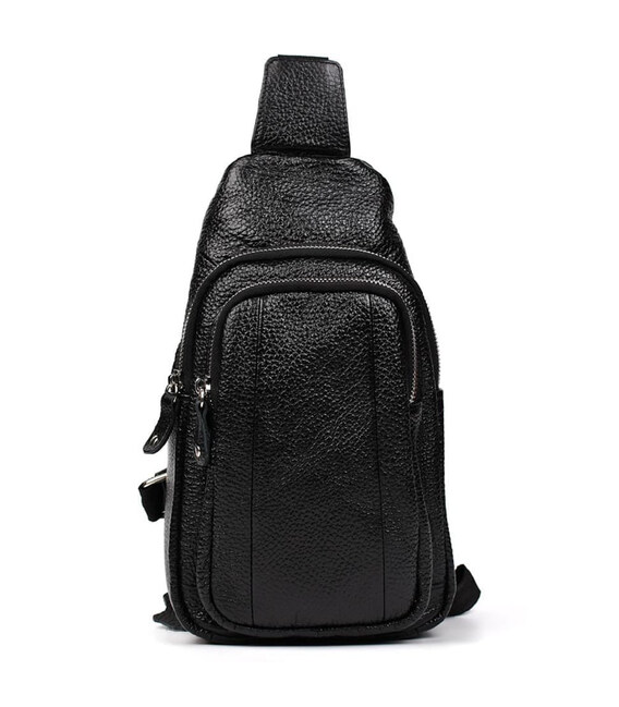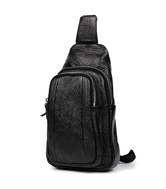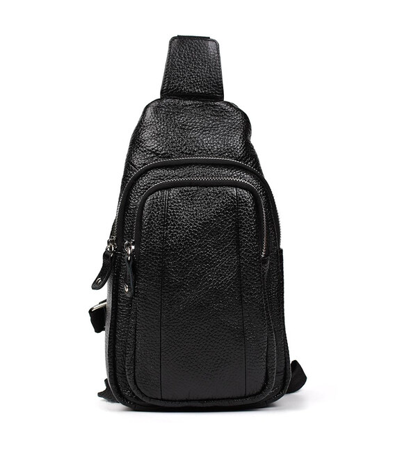 Нагрудна сумка шкіряна слінг рюкзак на одне плече Limary lim-8510 із чорної шкіри флотар. Матеріал нагрудної сумки: натуральна шкіра флотар Одне основне відділення на спіральній блискавці Передня горизонтальна кишеня на блискавці Розмір: 29*16*8 см