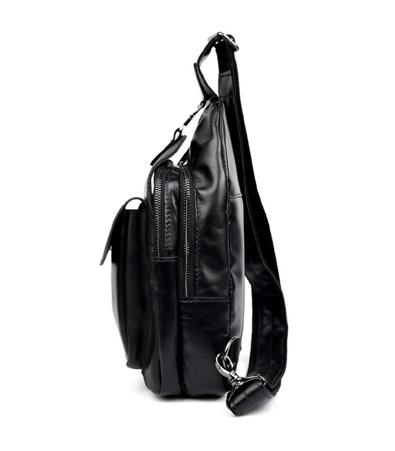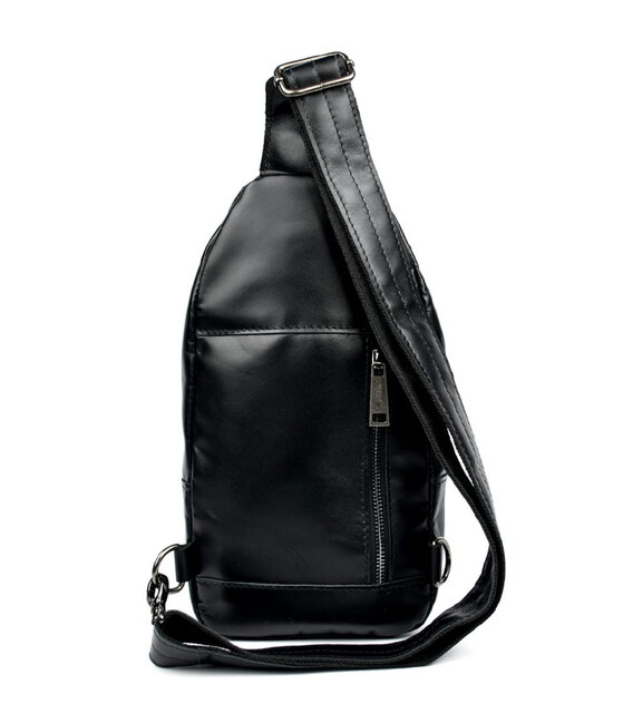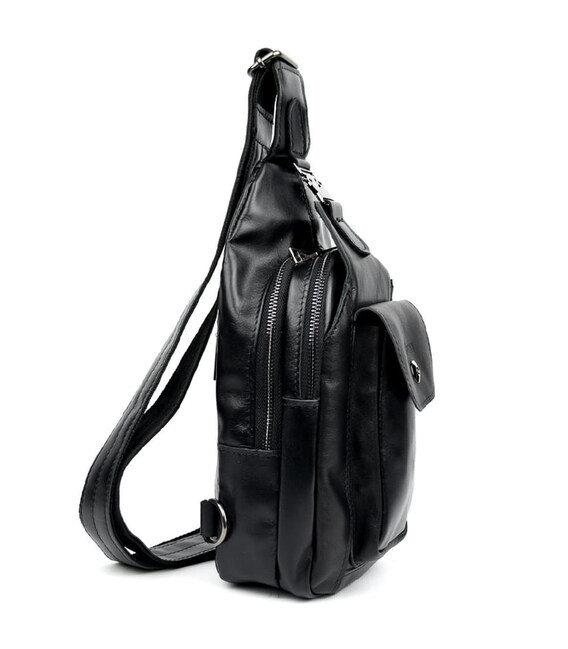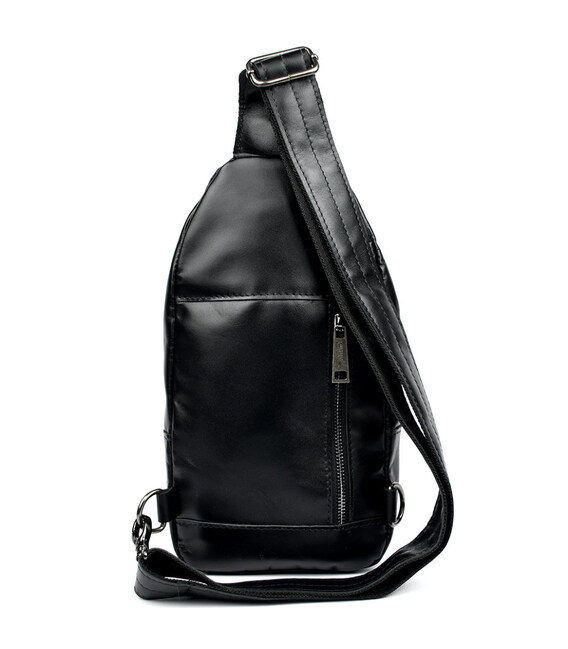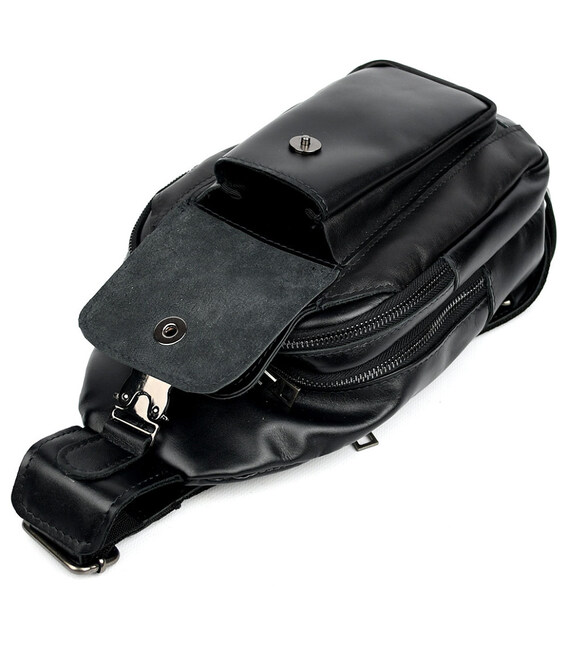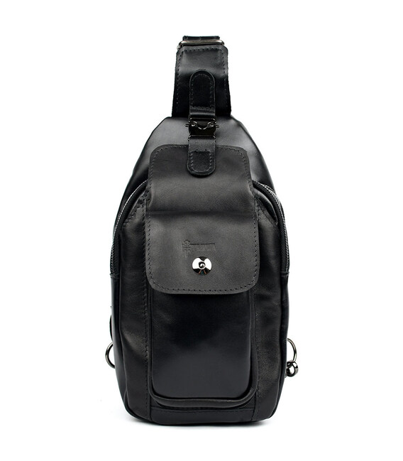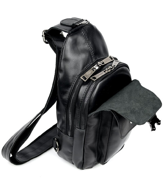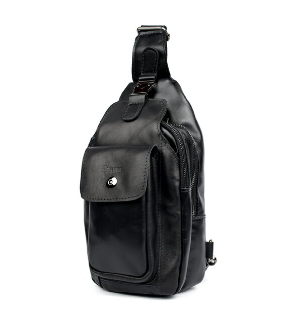 Модний рюкзак слінг на одну чорну шлейку TARWA GA-4007-3md з передньою кишенею для великого смартфона. Неповторного оригінального дизайну шкіряний рюкзак виконаний у класичному чорному кольорі. Це не тільки чудовий варіант для сучасного мешканця мегаполісу, але й одночасно модний шкіряний аксесуар на моношлейці через плече, при цьому стильний, сучасний, неординарний, зручний. Шкіряний рюкзак слінг ТАРВА 4007