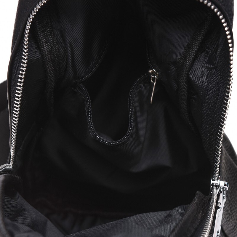 Рюкзак имеет 1 основное отделение. Внутри 1 карман на молнии. Снаружи 3 кармана на молнии. Подкладка- текстиль. Цвет фурнитуры- серебро. Плечевой ремень регулируется по длине.