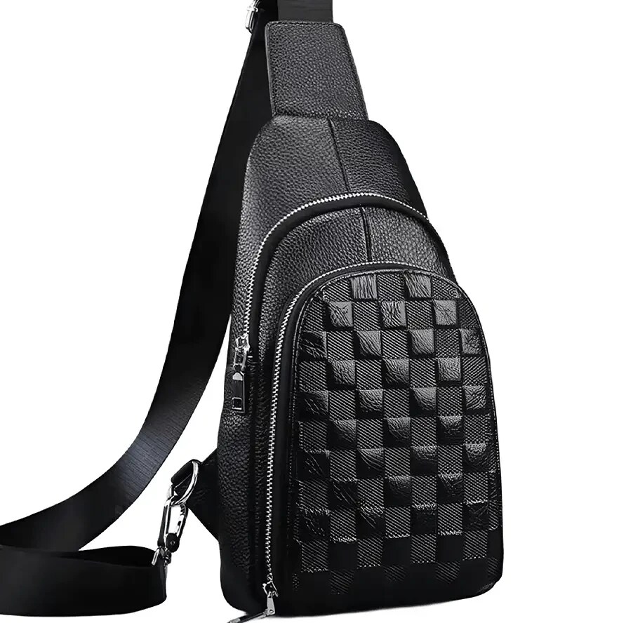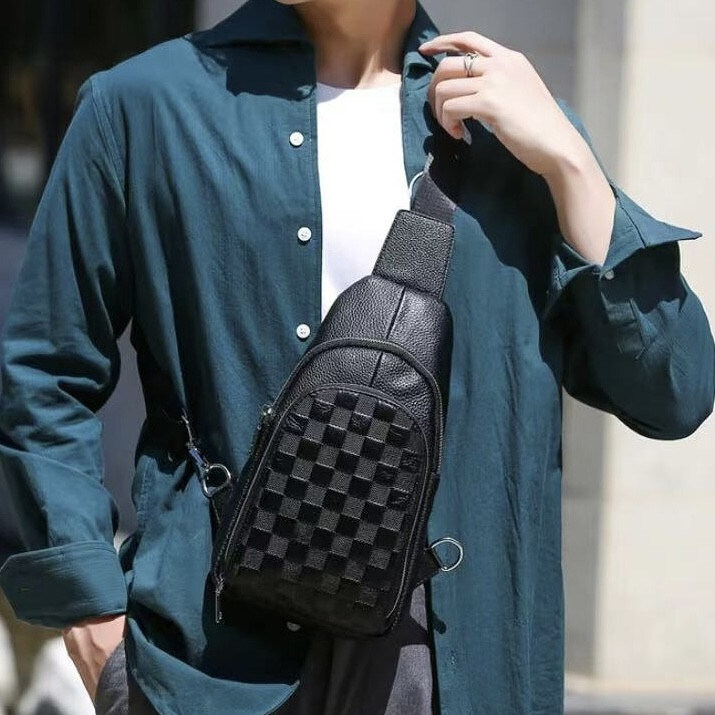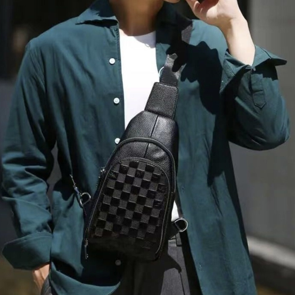 Черный кожаный слинг в зернистой коже. Качественный текстильный ремень позволяет удобно носить сумку