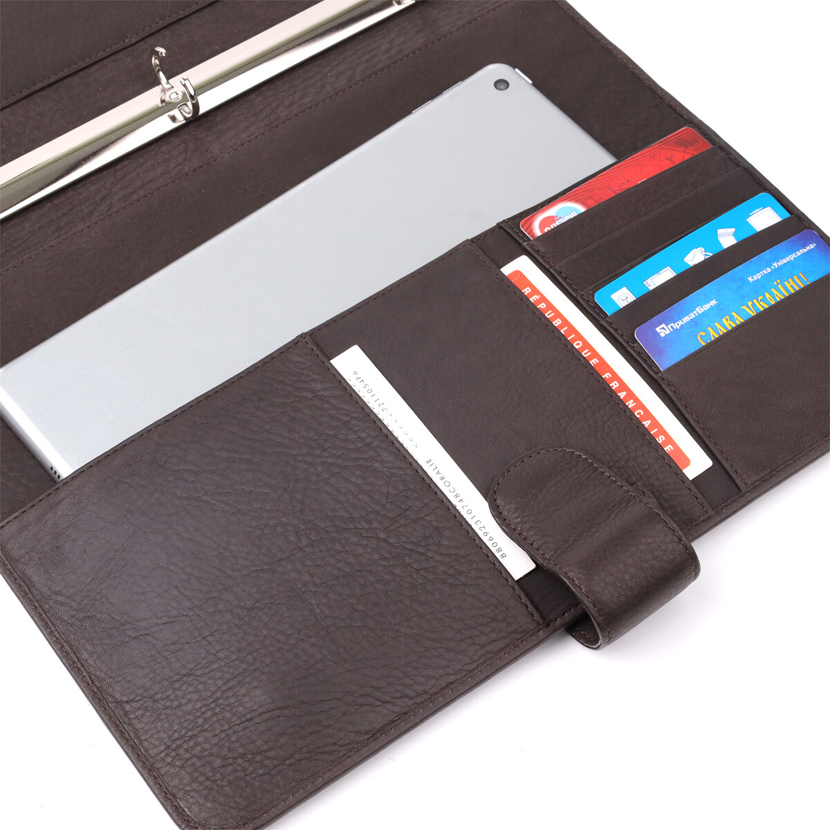 Органайзер из натуральной кожи коричневого цвета. Закрывается хлястиком на кнопку – надежно и удобно. Внутри предусмотрено восемь ячеек для карт, три прилегающих кармана и металлический держатель для файлов формата А4. На лицевой стороне в нижнем правом углу расположен фирменный металлический логотип бренда, подчеркивающий стиль и аутентичность изделия.