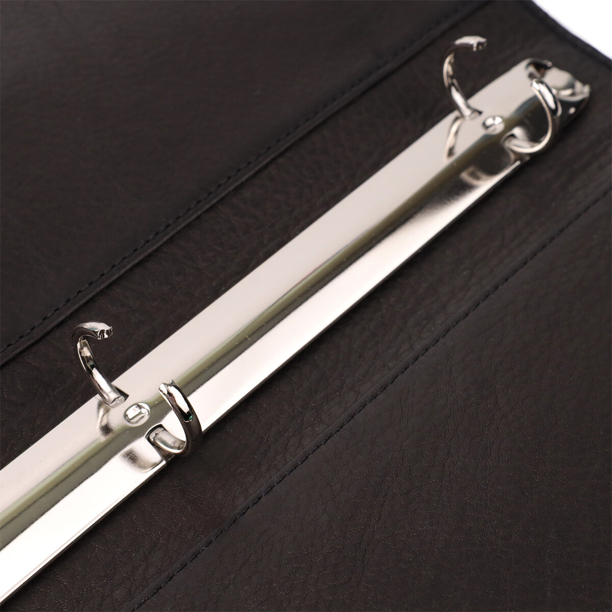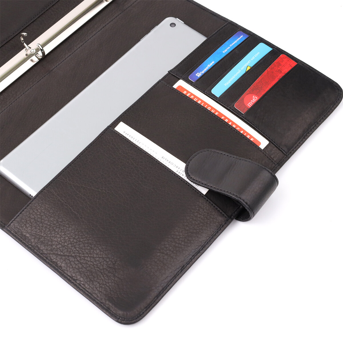 Органайзер из натуральной кожи черного цвета. Закрывается хлястиком на кнопку – надежно и удобно. Внутри предусмотрено восемь ячеек для карт, три прилегающих кармана и металлический держатель для файлов формата А4. На лицевой стороне в нижнем правом углу расположен фирменный металлический логотип бренда, подчеркивающий стиль и аутентичность изделия.
